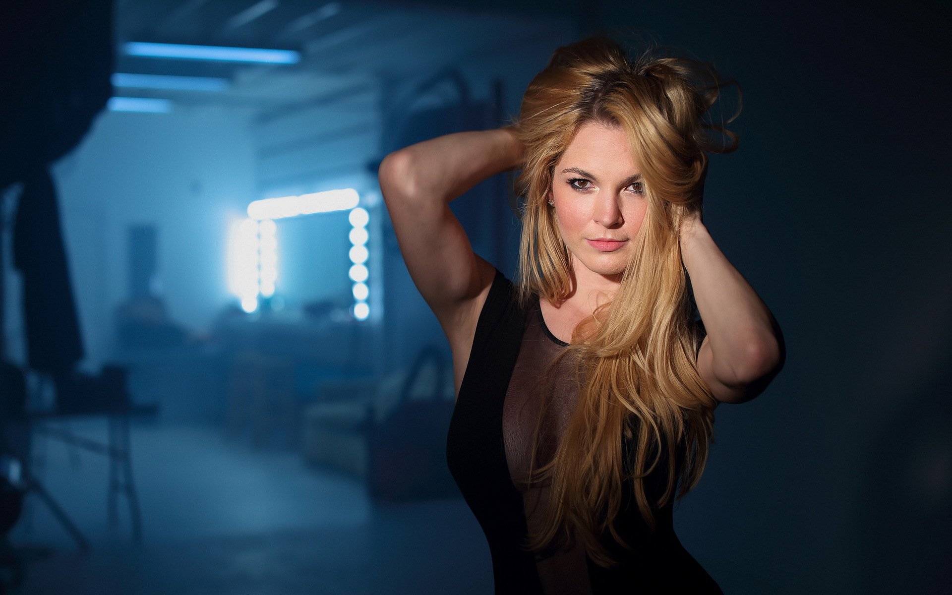 Sexy blonde girl posing in a black dress - wallpapers for your phone