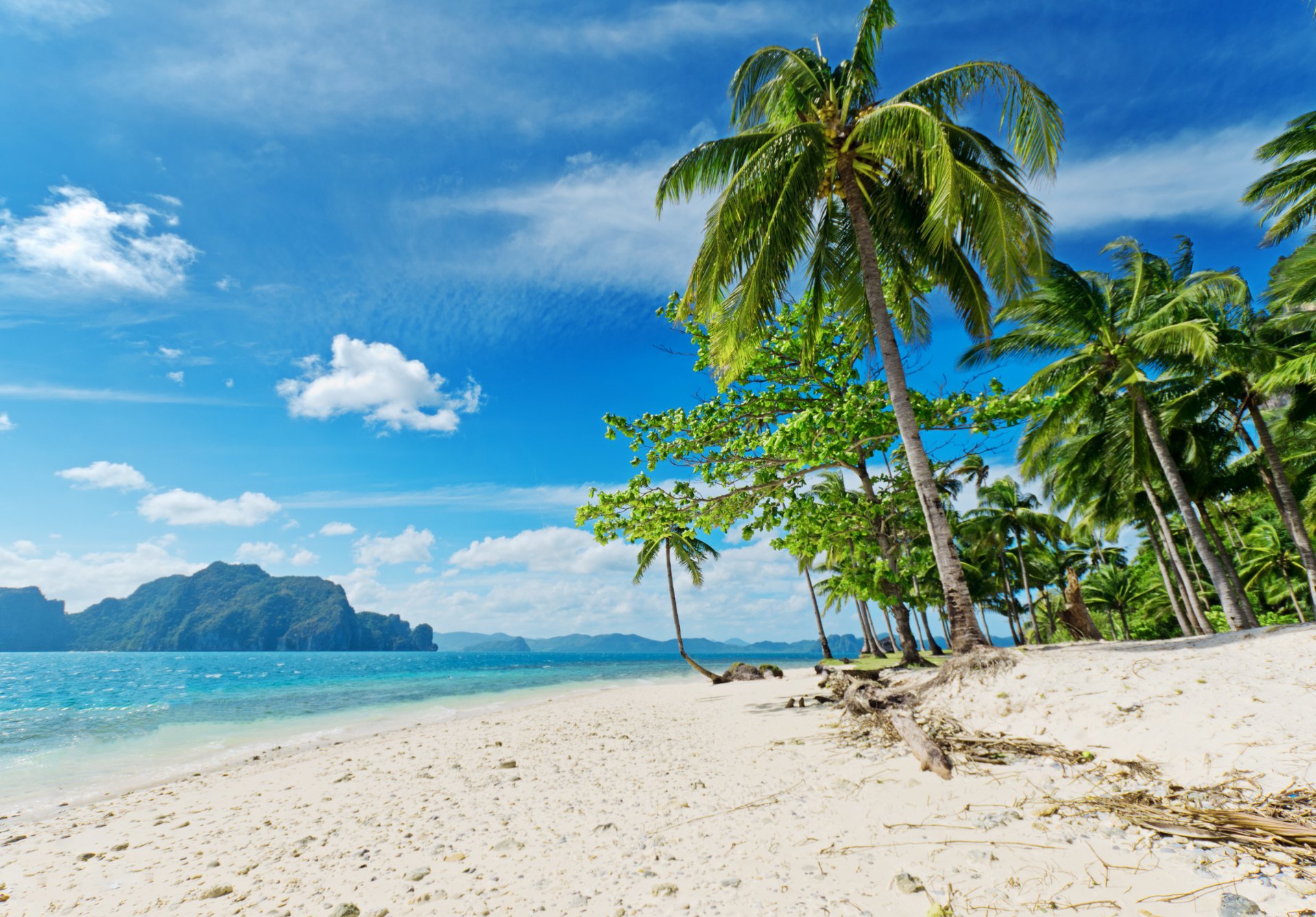 Beach, white sand, palm trees. there are two sun beds under the umbrella