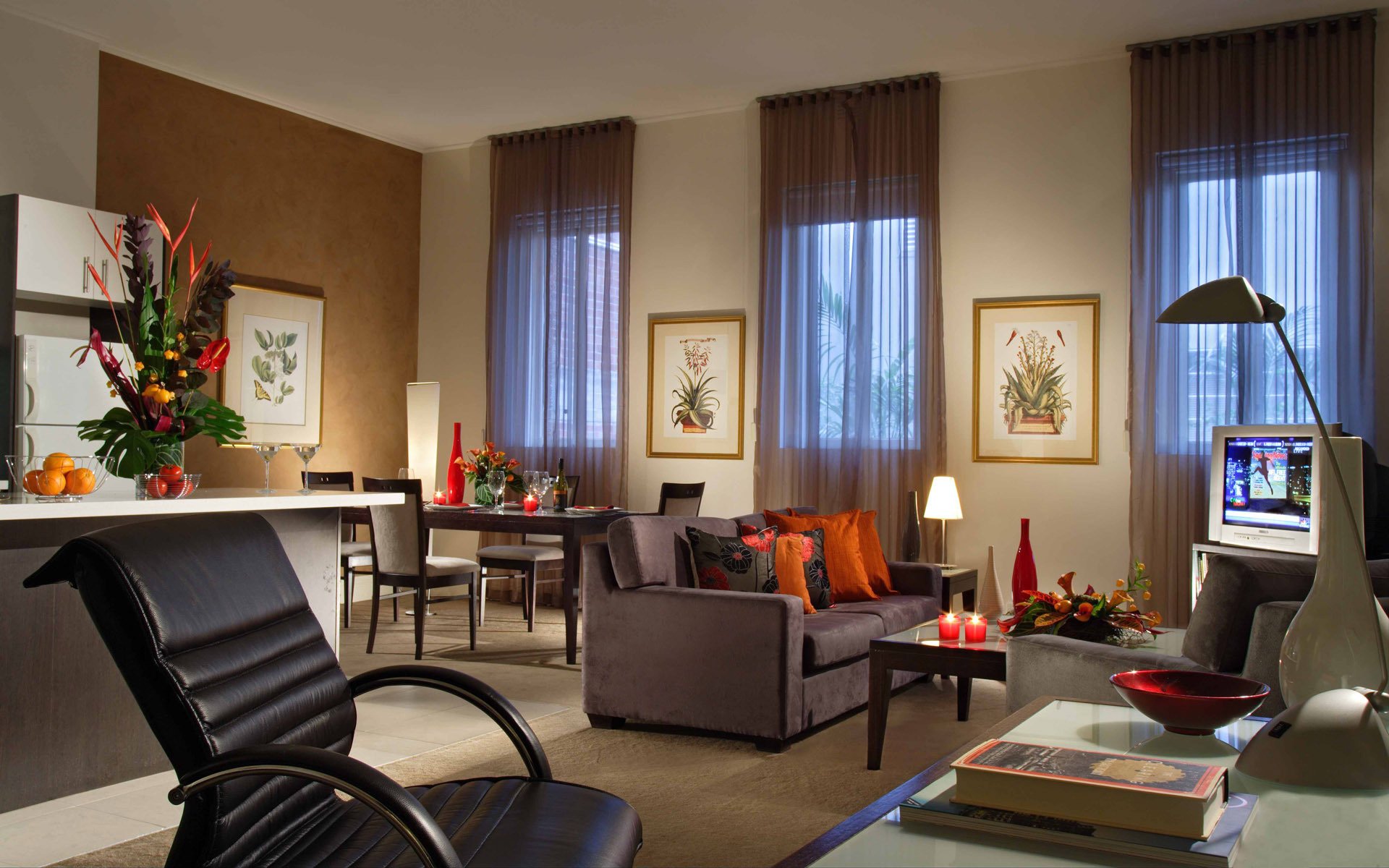 Stylish design of the living room. sofa with pillows, leather armchair, flowers, champagne and grapesStylish design of the living room. Sofa with pillows, leather armchair, flowers, champagne and grapes