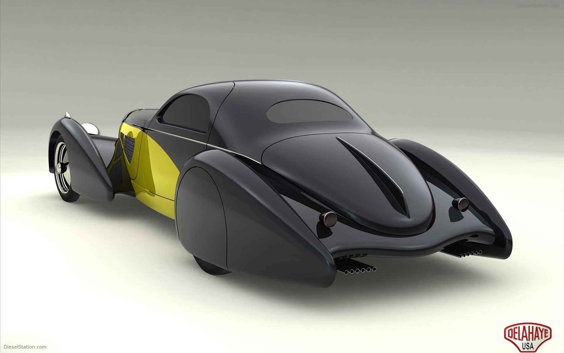 Black classic car with closed rear wheels