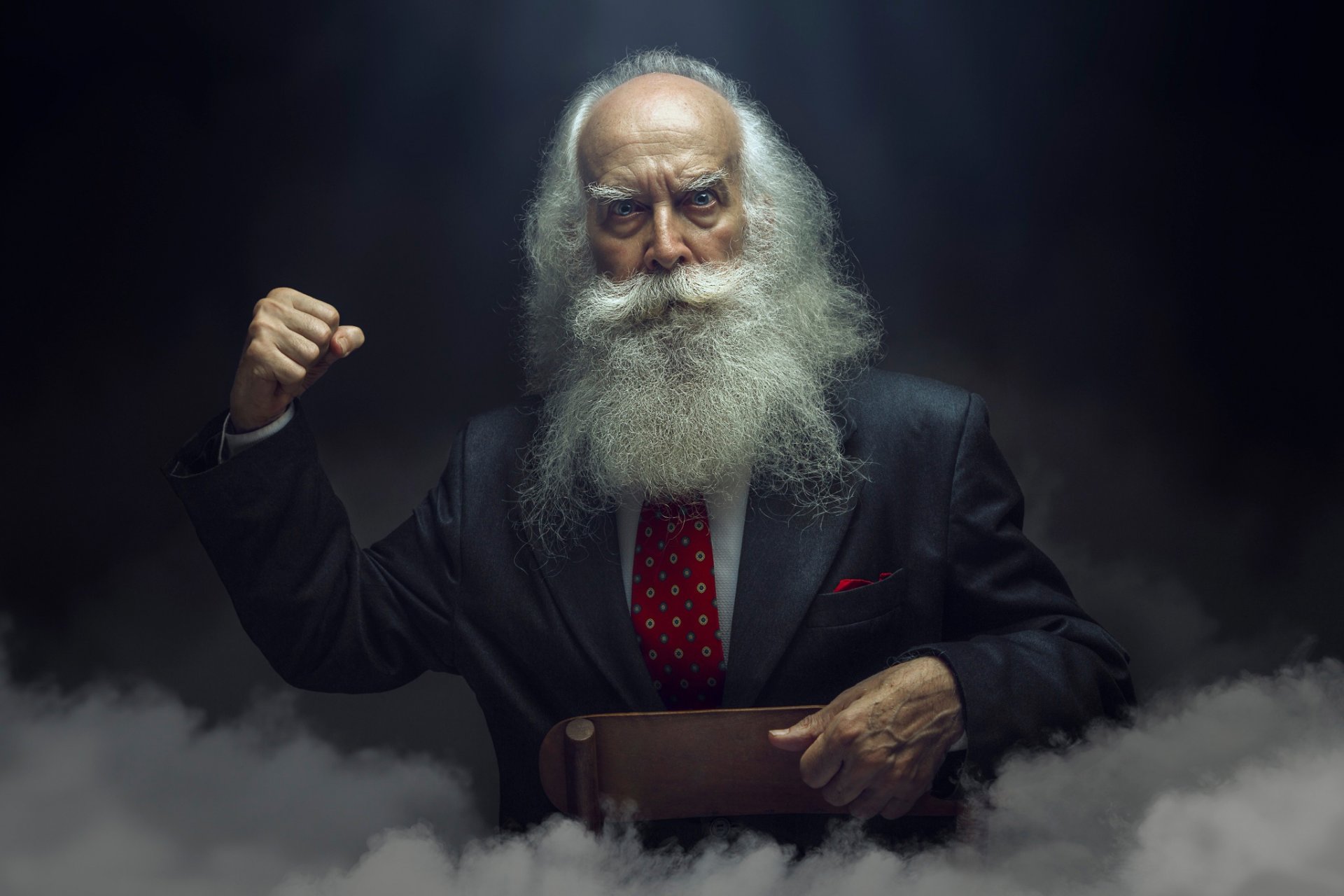 A red-bearded viking in a helmet sits and gets angryA red-bearded Viking in a helmet sits and gets angry