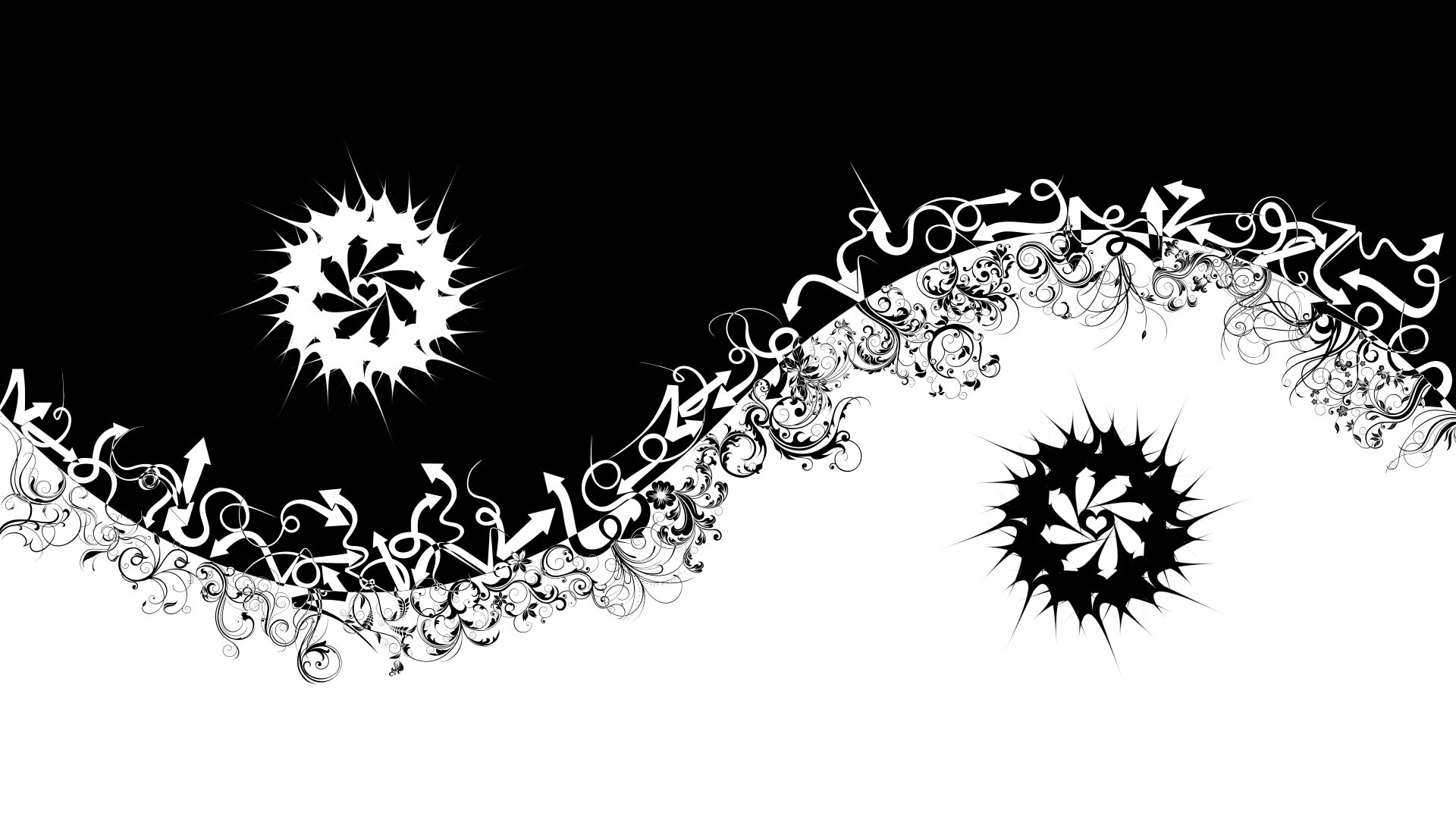 A black kitten with red eyes and a yin-yang amulet on a background of white bubbles in blue tones