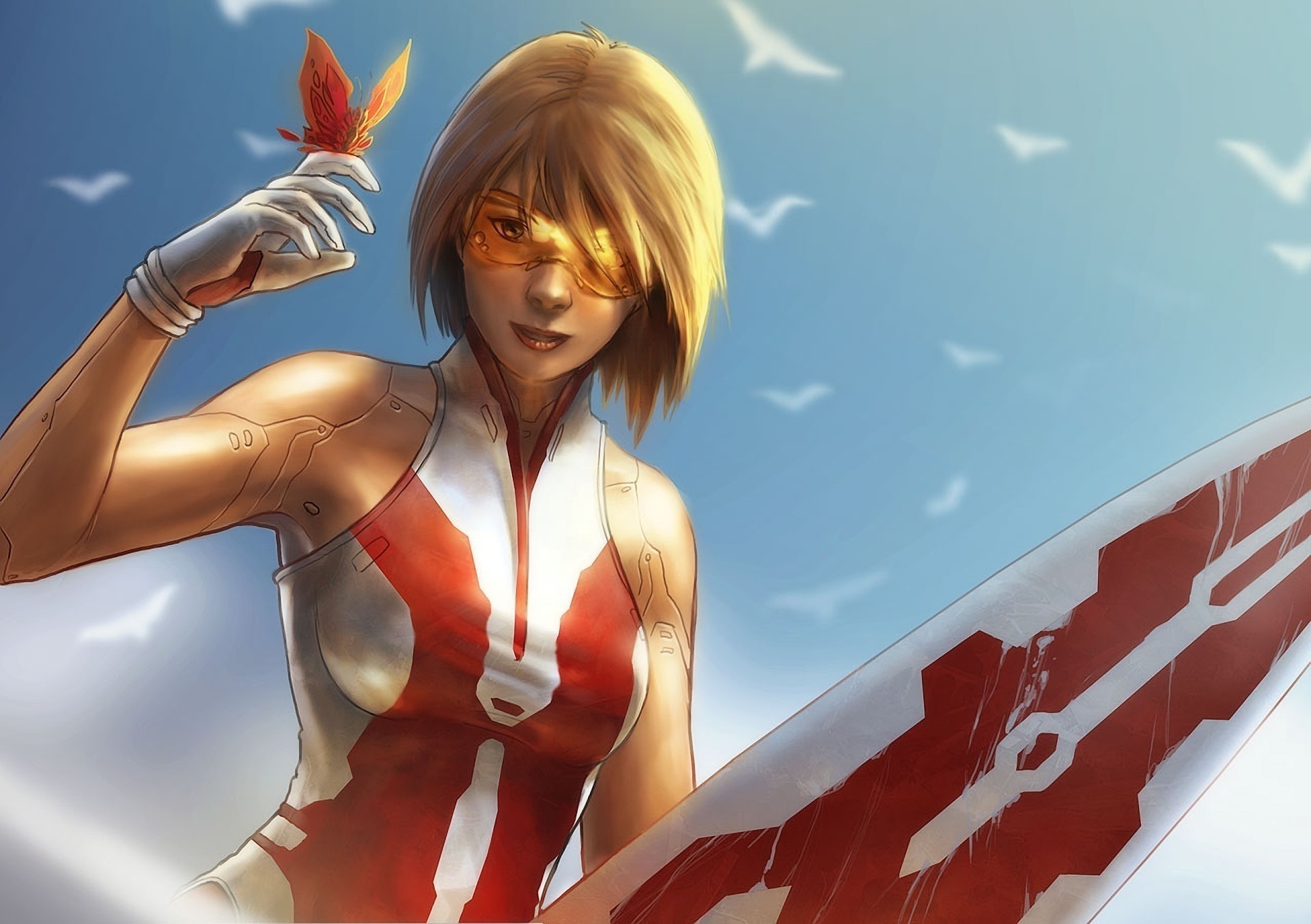 A picture of a girl in a swimsuit and glasses and a surfboardA picture of a girl in a swimsuit and glasses and a surfboard