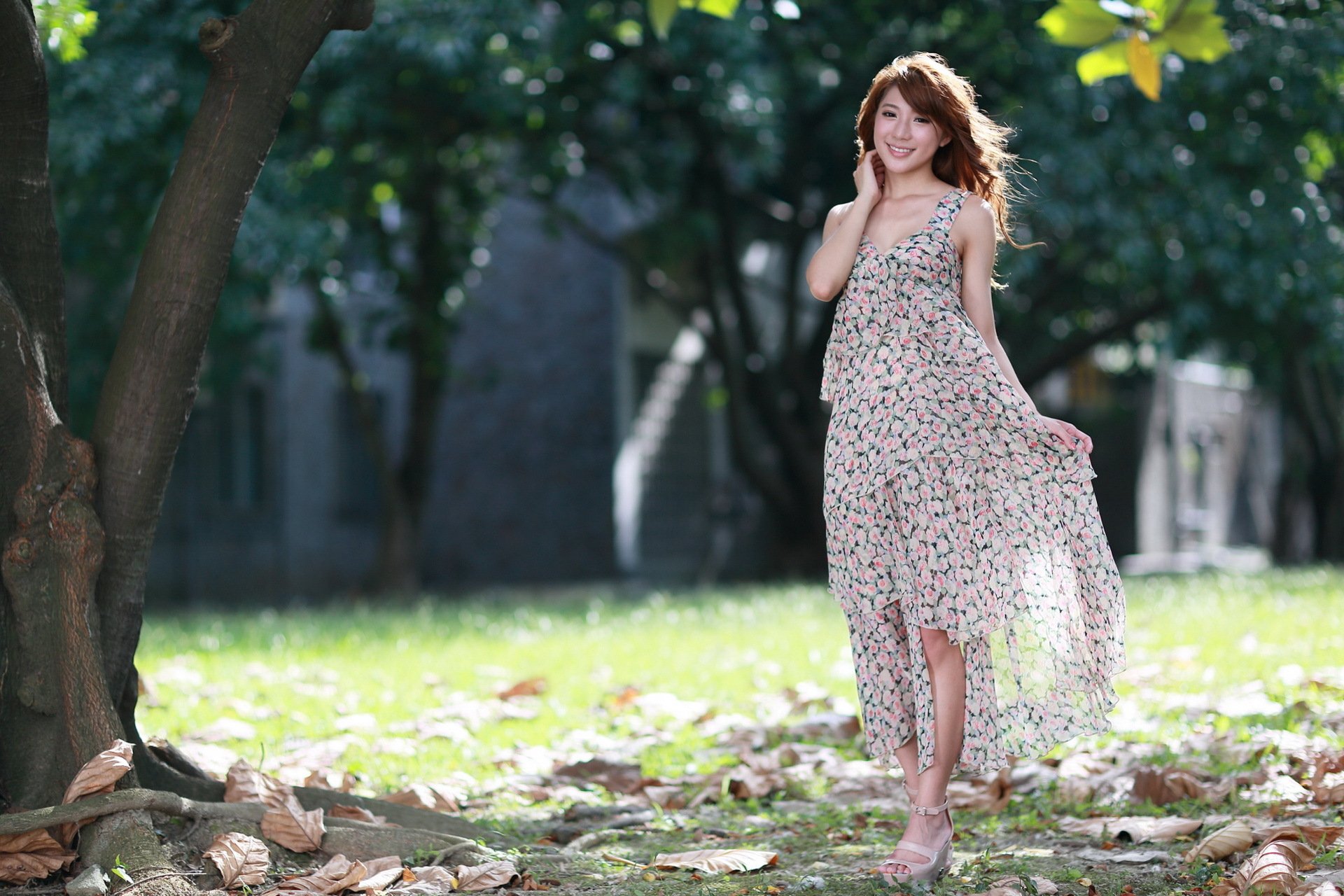 A girl in a dress on a knee