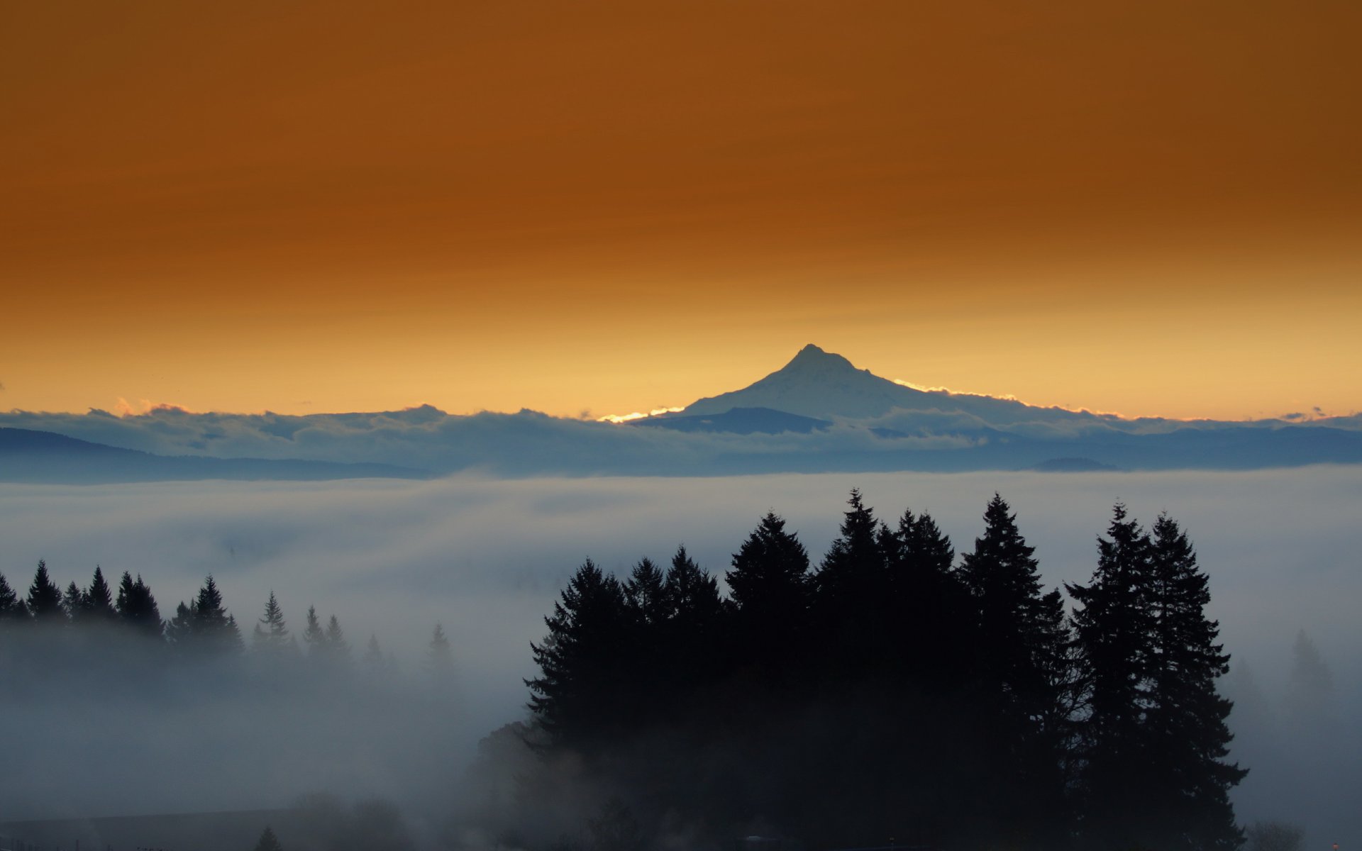 Trees and sunset over the mountain top