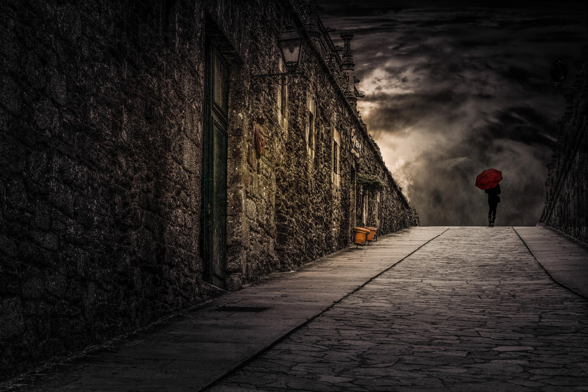 And it's raining and a girl on the road with an umbrellaAnd it's raining and a girl on the road with an umbrella