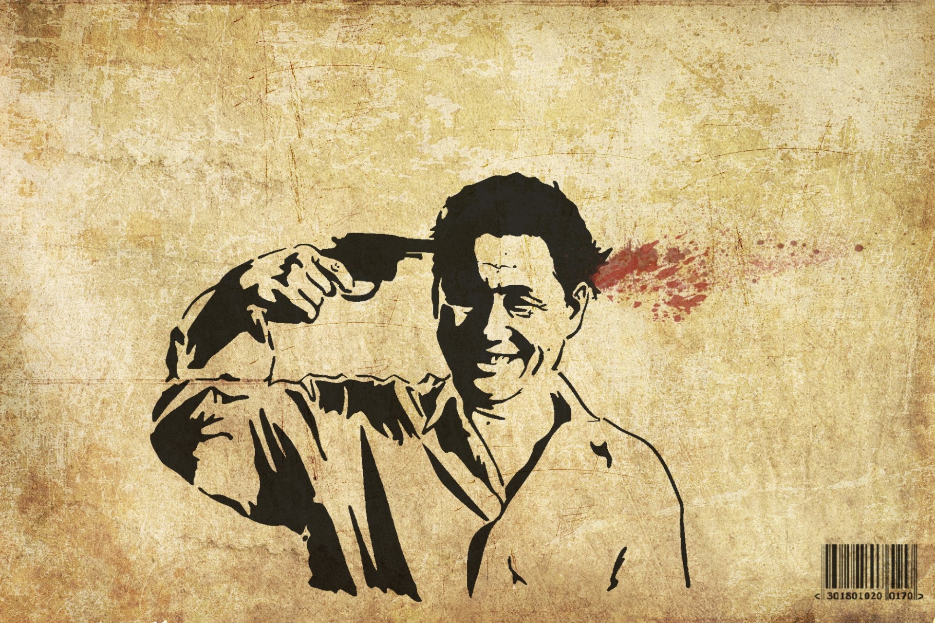 A drawing with a smiling man committing suicide with a gun and a barcode