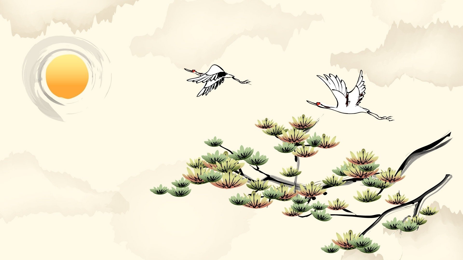 Painting cranes are flying, the sun and a branch