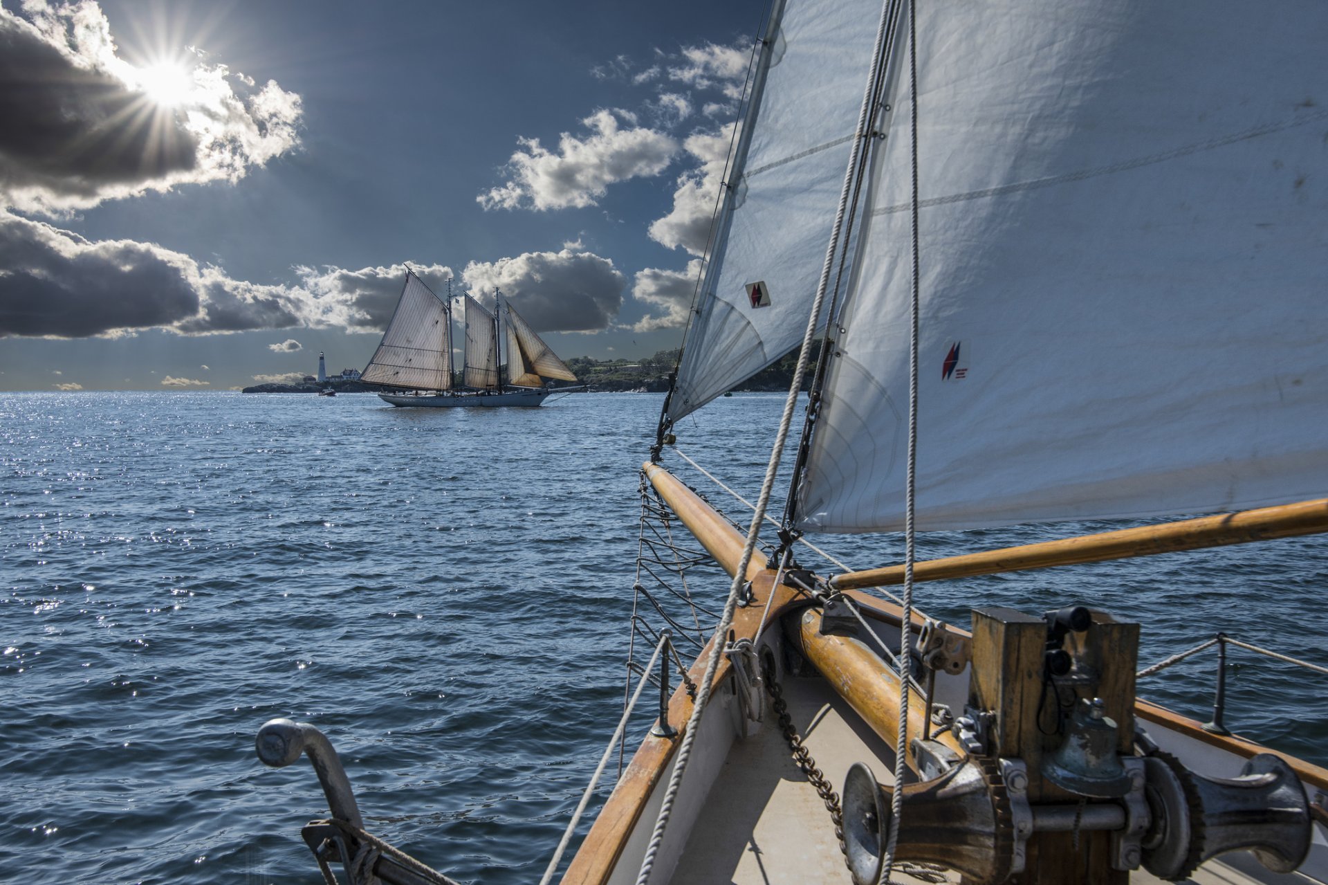 Boats sail around the bay with their sails spread