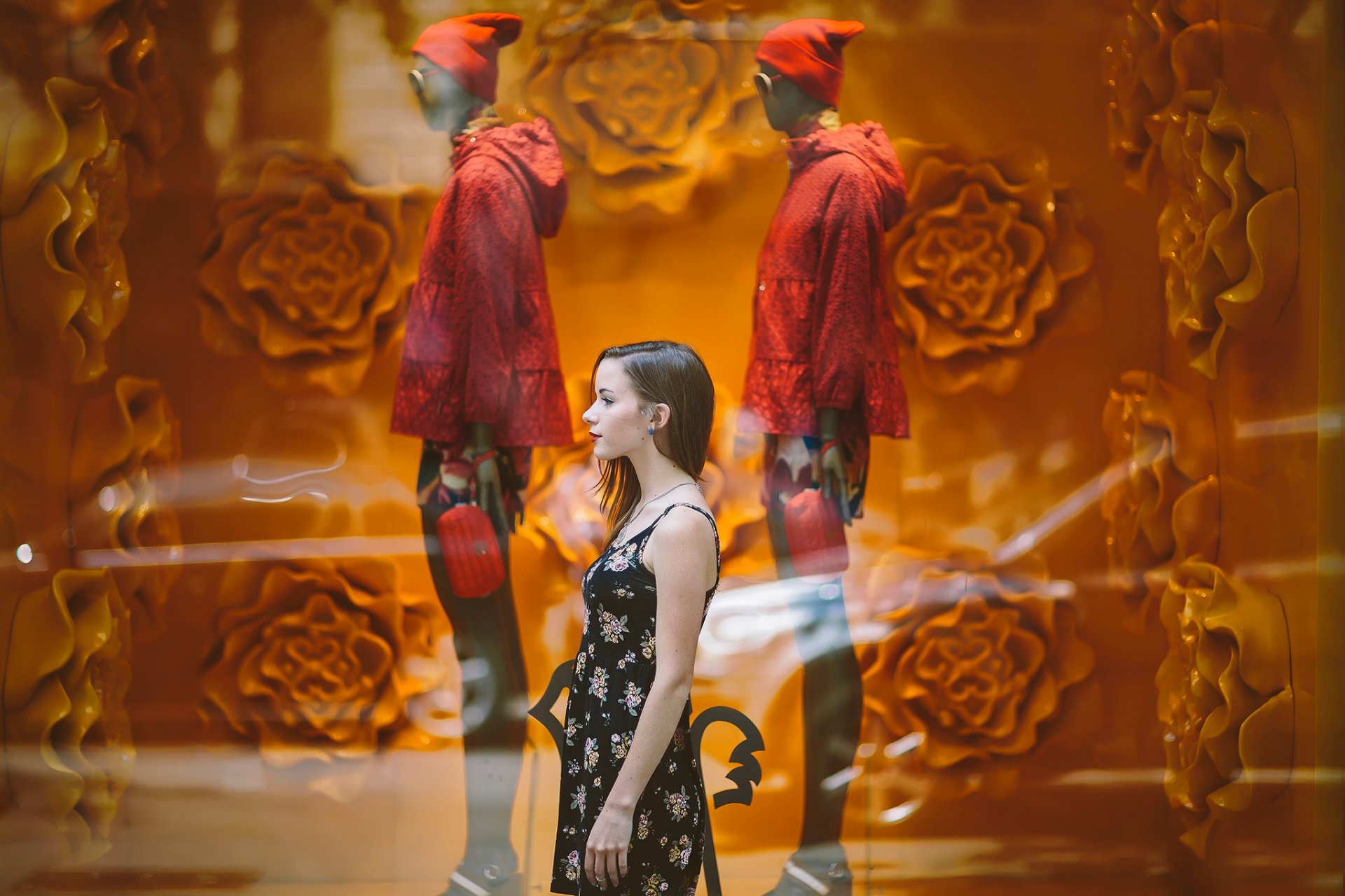 A girl in a black dress on the background of the wallsA girl in a black dress on the background of the walls