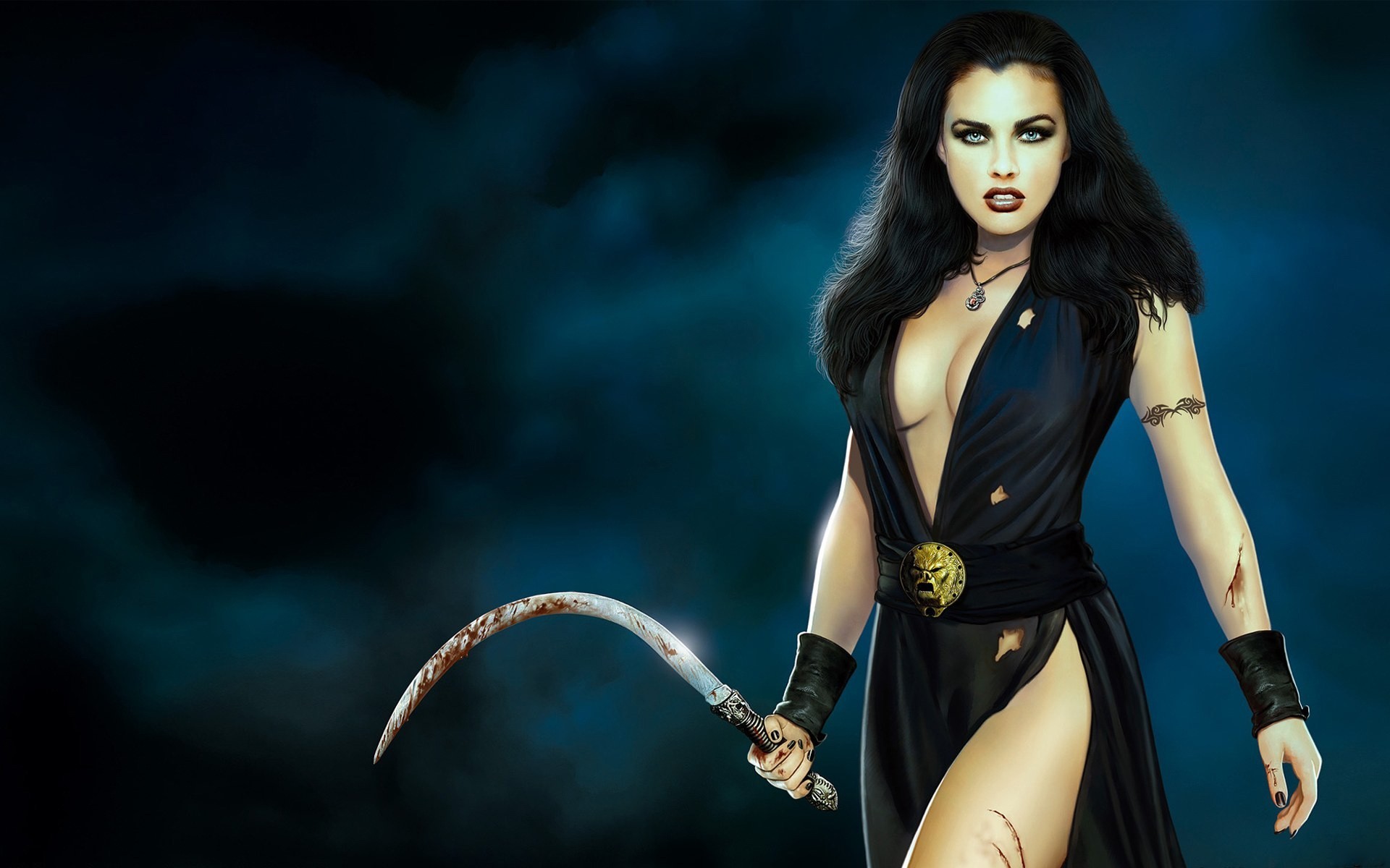 Brunette in a black dress with a sickle in her handsBrunette in a black dress with a sickle in her hands