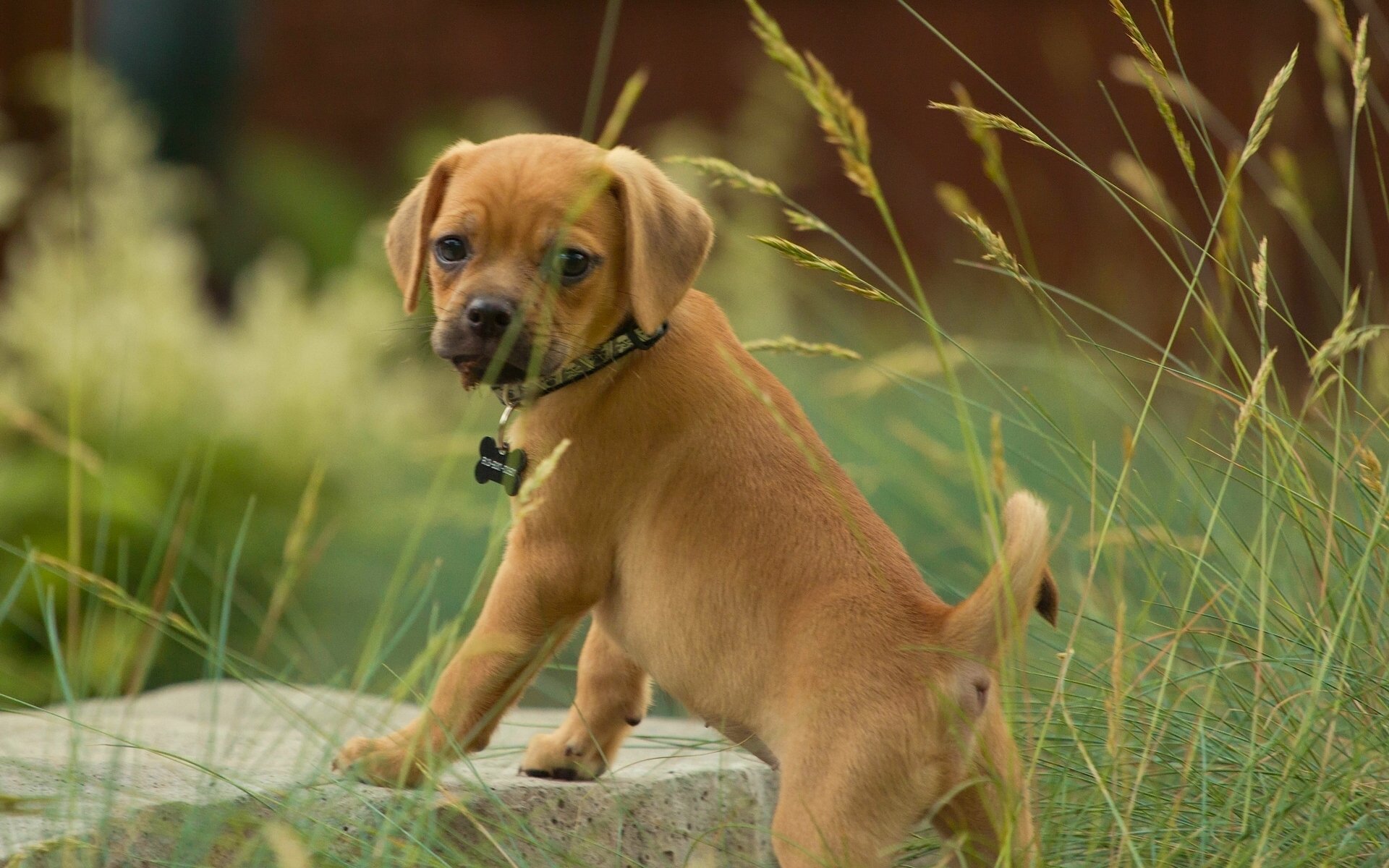 The puppy pagl is standing in the grass