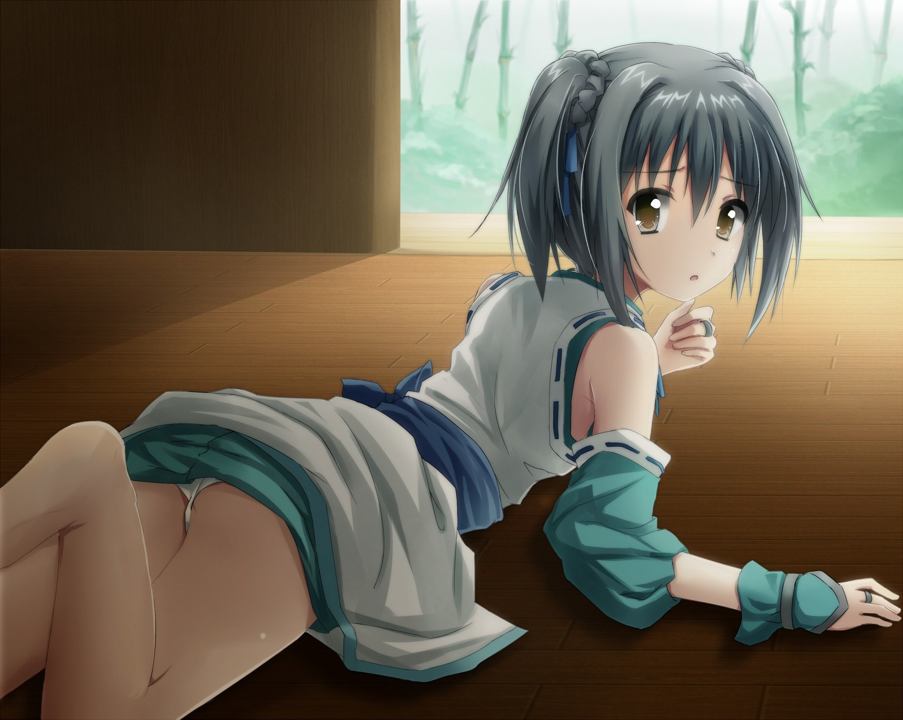 A girl lying in a blue dress on the floor with an appleA girl lying in a blue dress on the floor with an apple