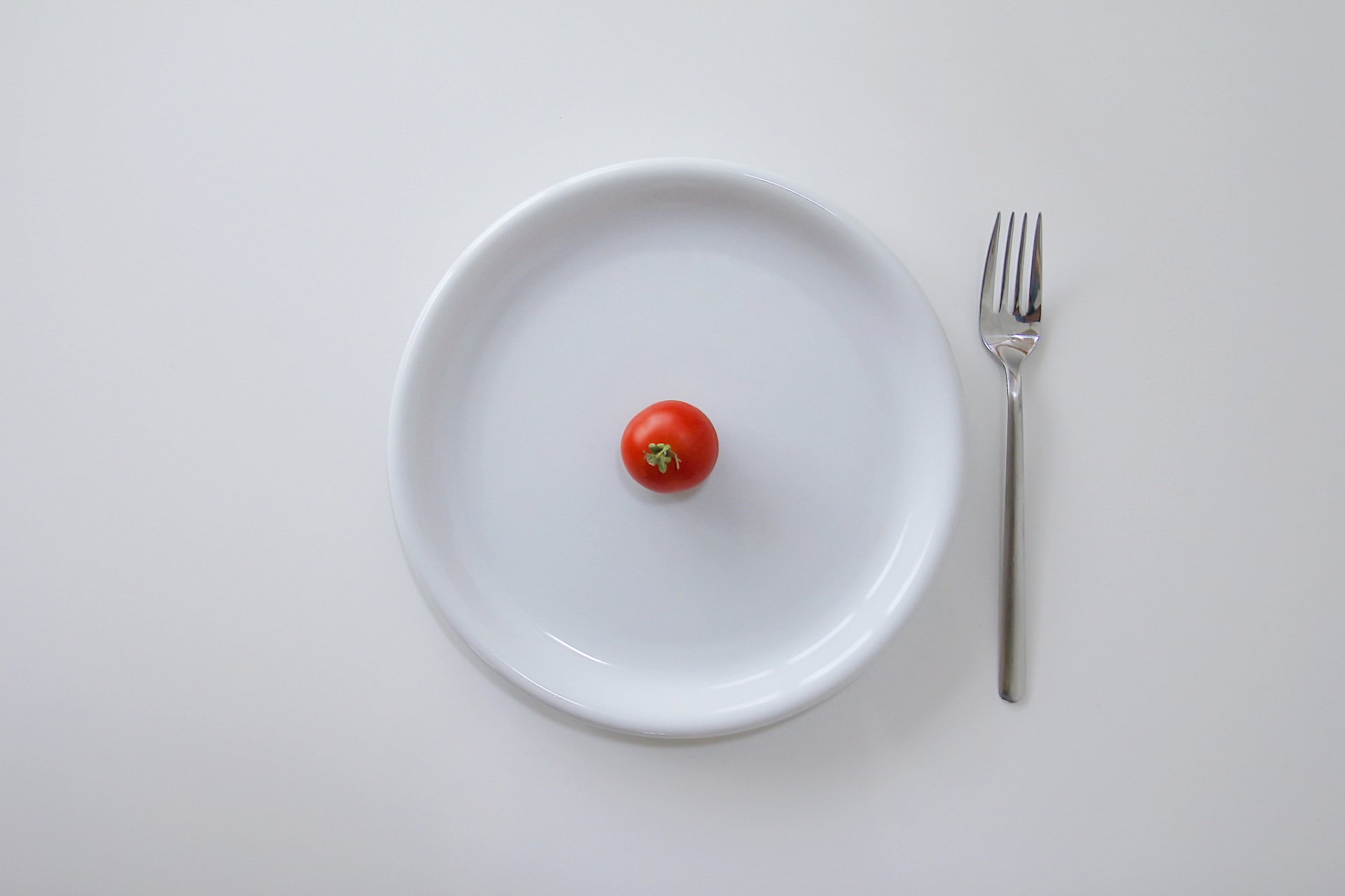 On a white table is a white plate with a cherry tomato and a forkOn a white table is a white plate with a cherry tomato and a fork