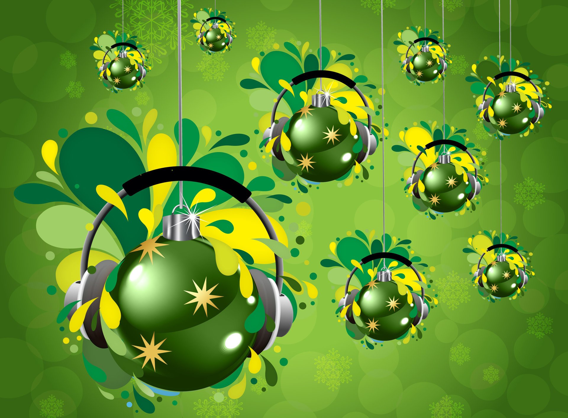Christmas toys with headphones on a green backgroundChristmas toys with headphones on a green background