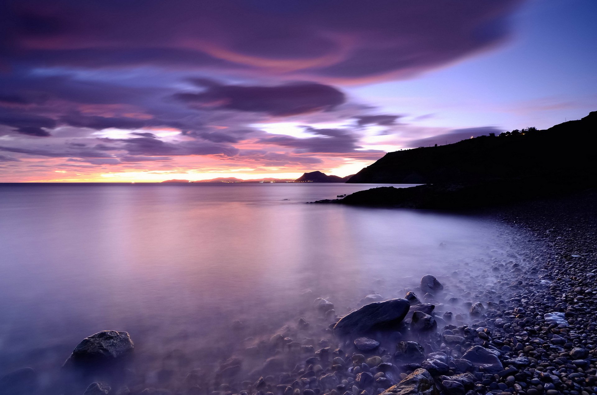 Lilac sunset on the seashore