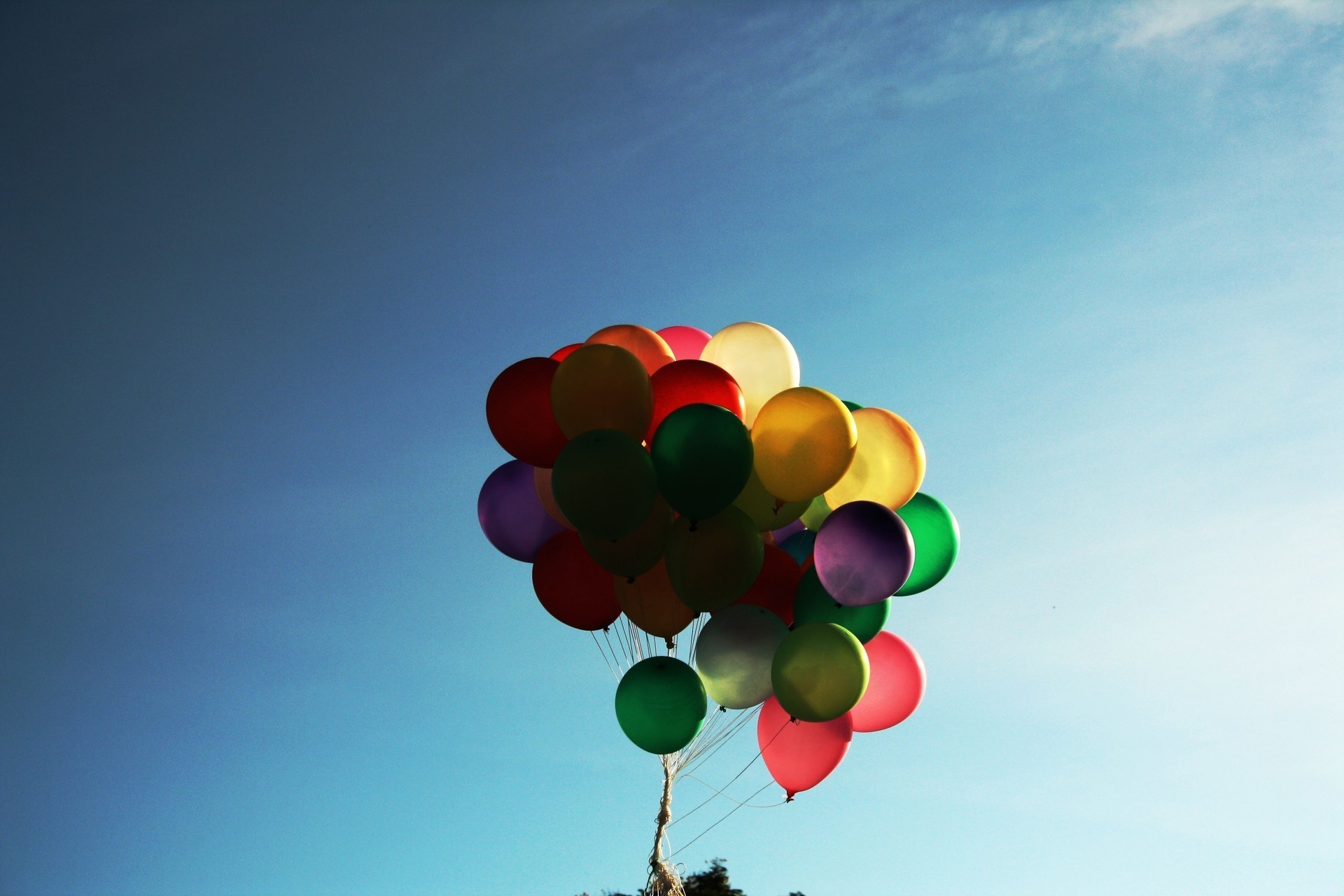 A balloon of rainbow colors flying in a cloudless skyA balloon of rainbow colors flying in a cloudless sky