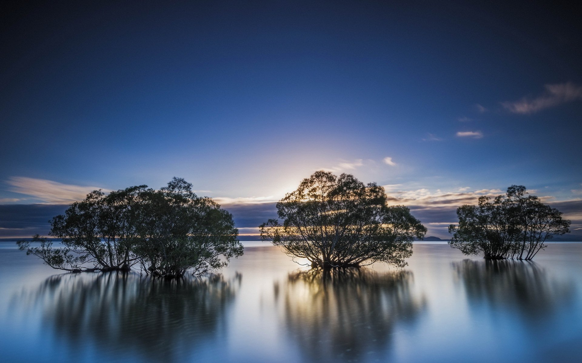 Coniferous forest against the background of snow-covered mountains and bright blue sky in a mirror reflection of the calm surface of the lakeConiferous forest against the background of snow-covered mountains and bright blue sky in a mirror reflection of the calm surface of the lake