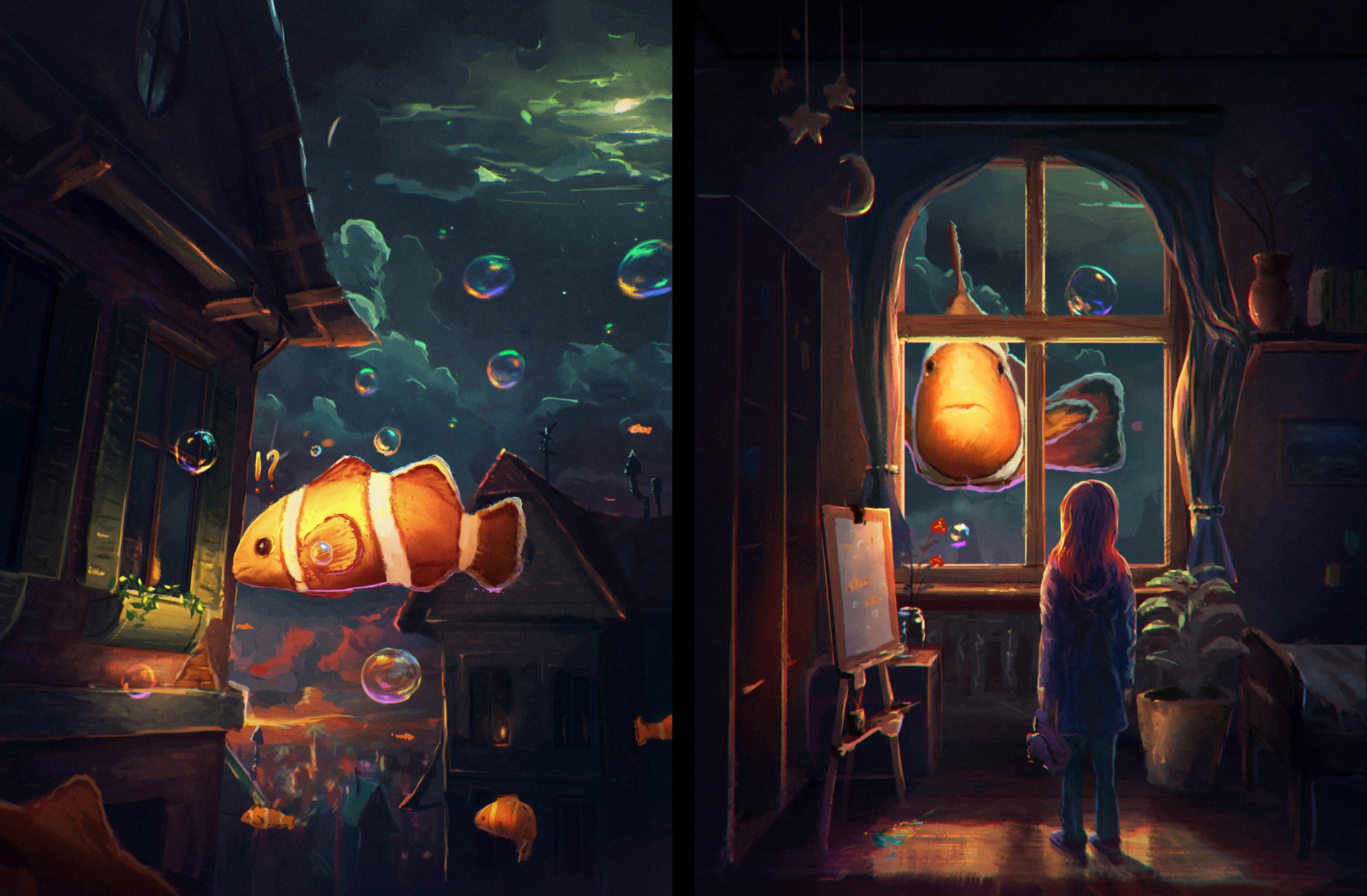 Fantastic art with fish in the night sky outside the window