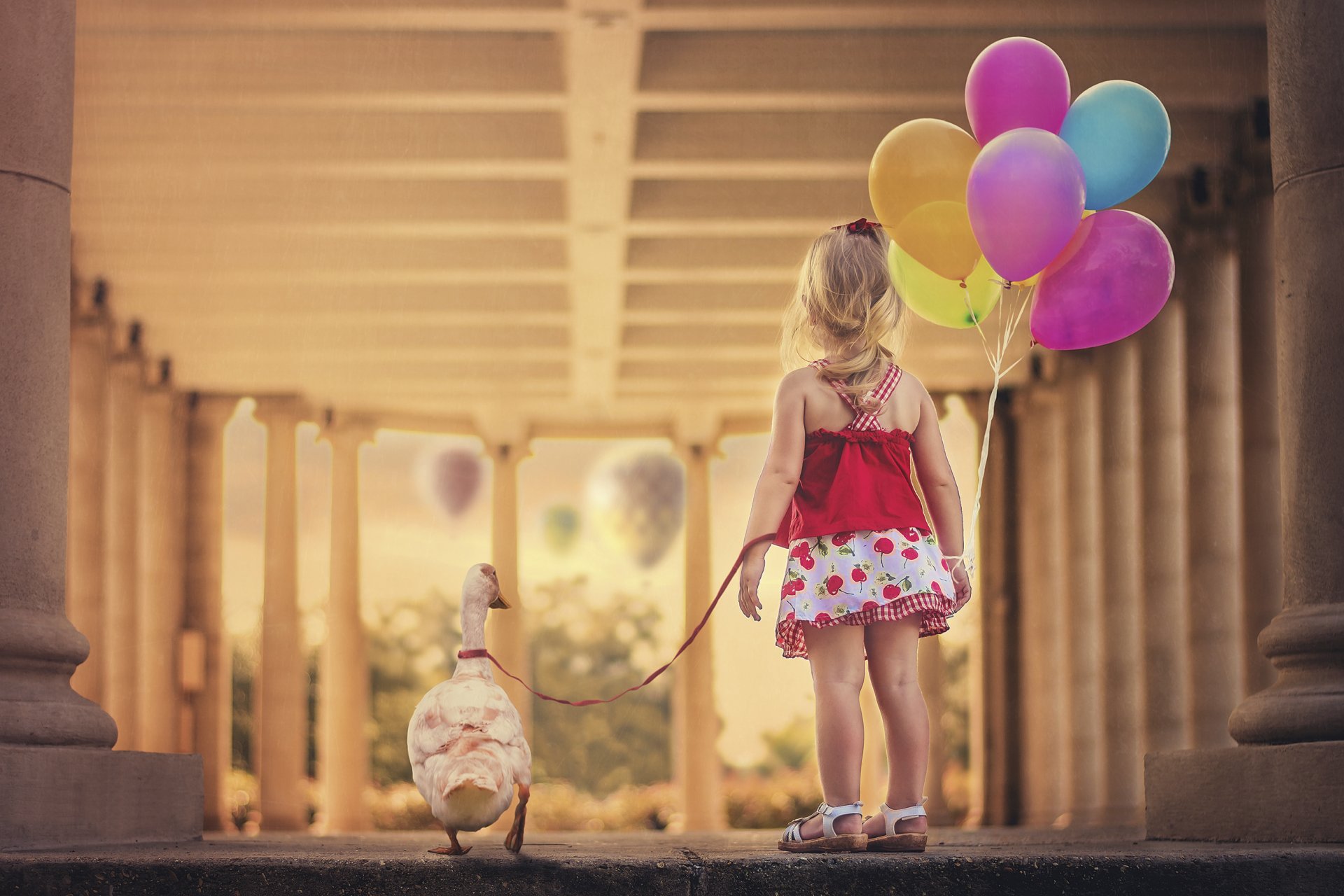 A little girl in a dress with berries holds a goose and colorful balloons on a red leashA little girl in a dress with berries holds a goose and colorful balloons on a red leash