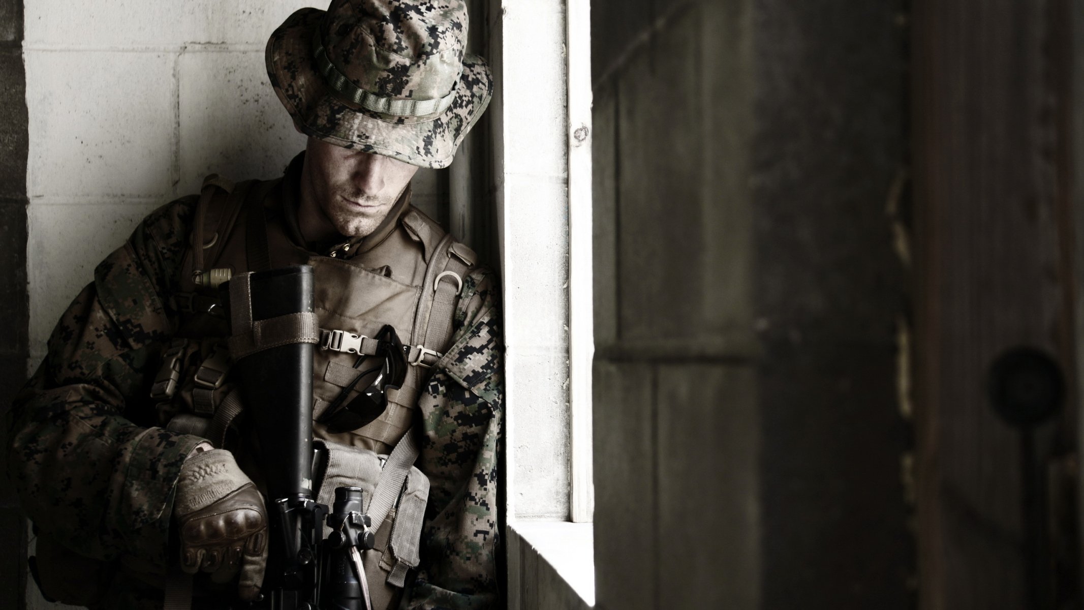 Photo of a soldier with a gun in his hands against the background of brick wallsPhoto of a soldier with a gun in his hands against the background of brick walls