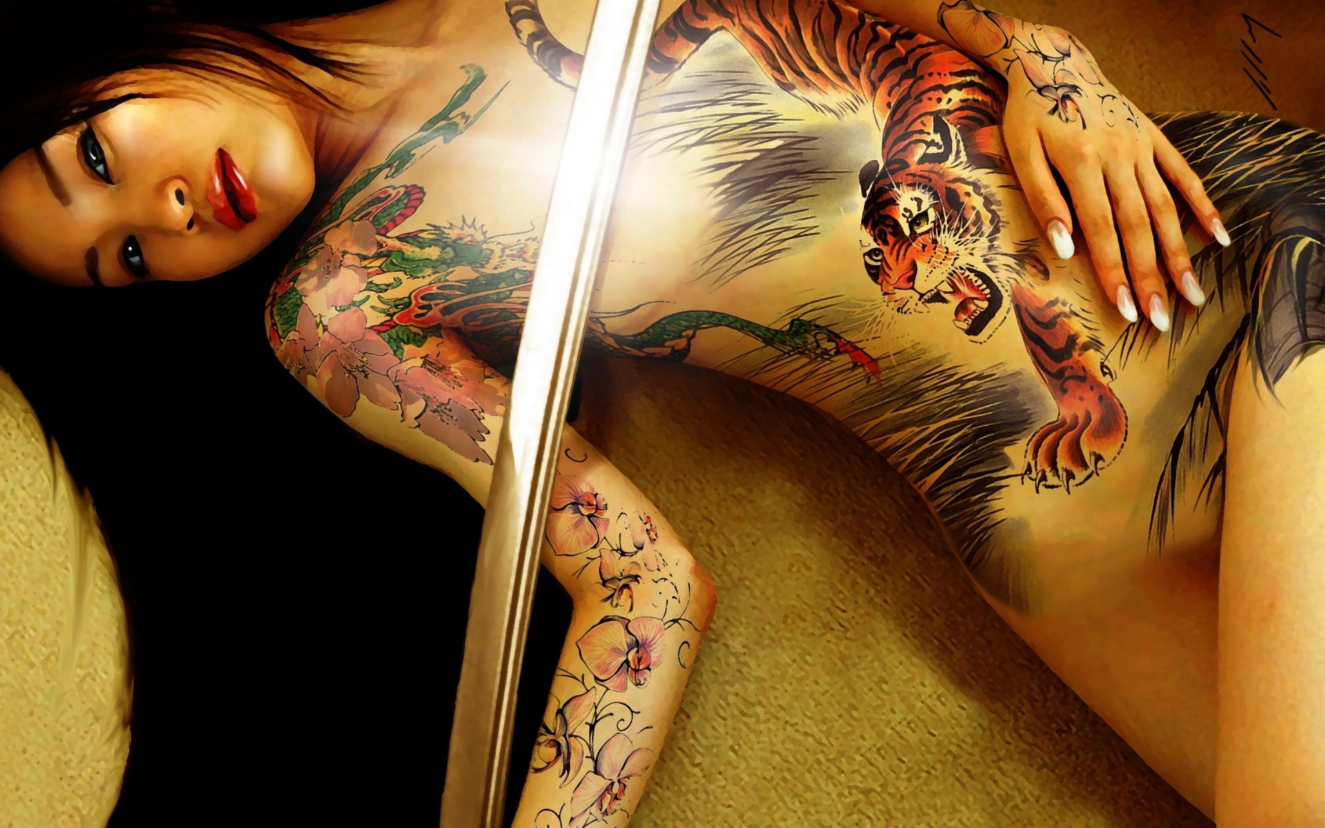 Beautiful brunette with a dragon tattoo on her backBeautiful brunette with a dragon tattoo on her back