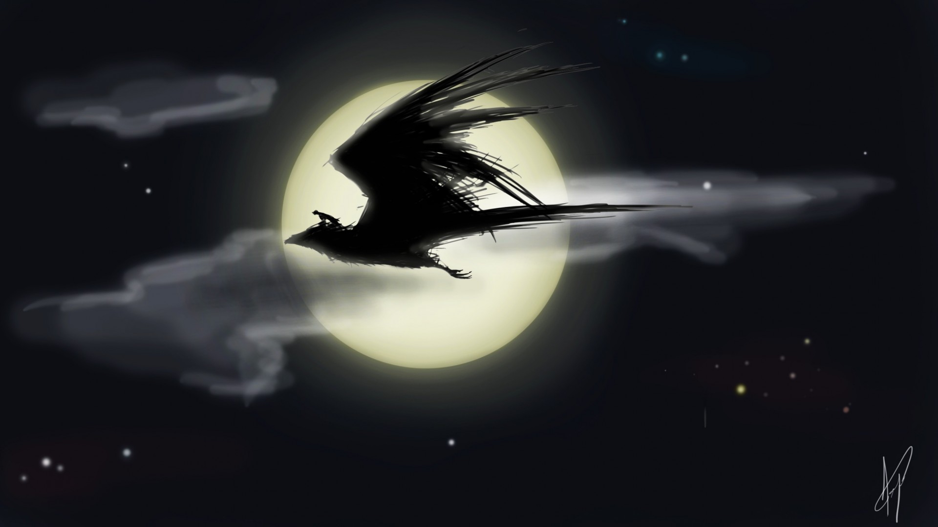 A bird rider at night on the background of the moonA bird rider at night on the background of the moon