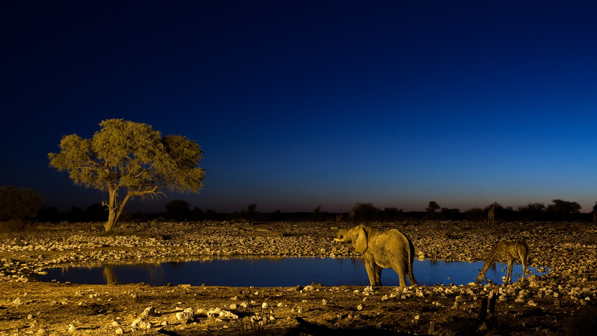 Elephant and giraffe at a watering hole at night in africaElephant and giraffe at a watering hole at night in Africa