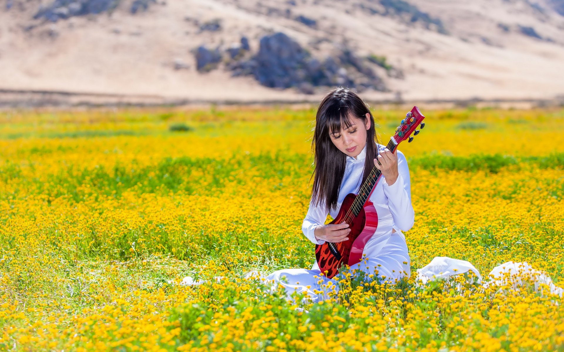 Andel girl with a guitar on the roof looks at the night cityAndel girl with a guitar on the roof looks at the night city