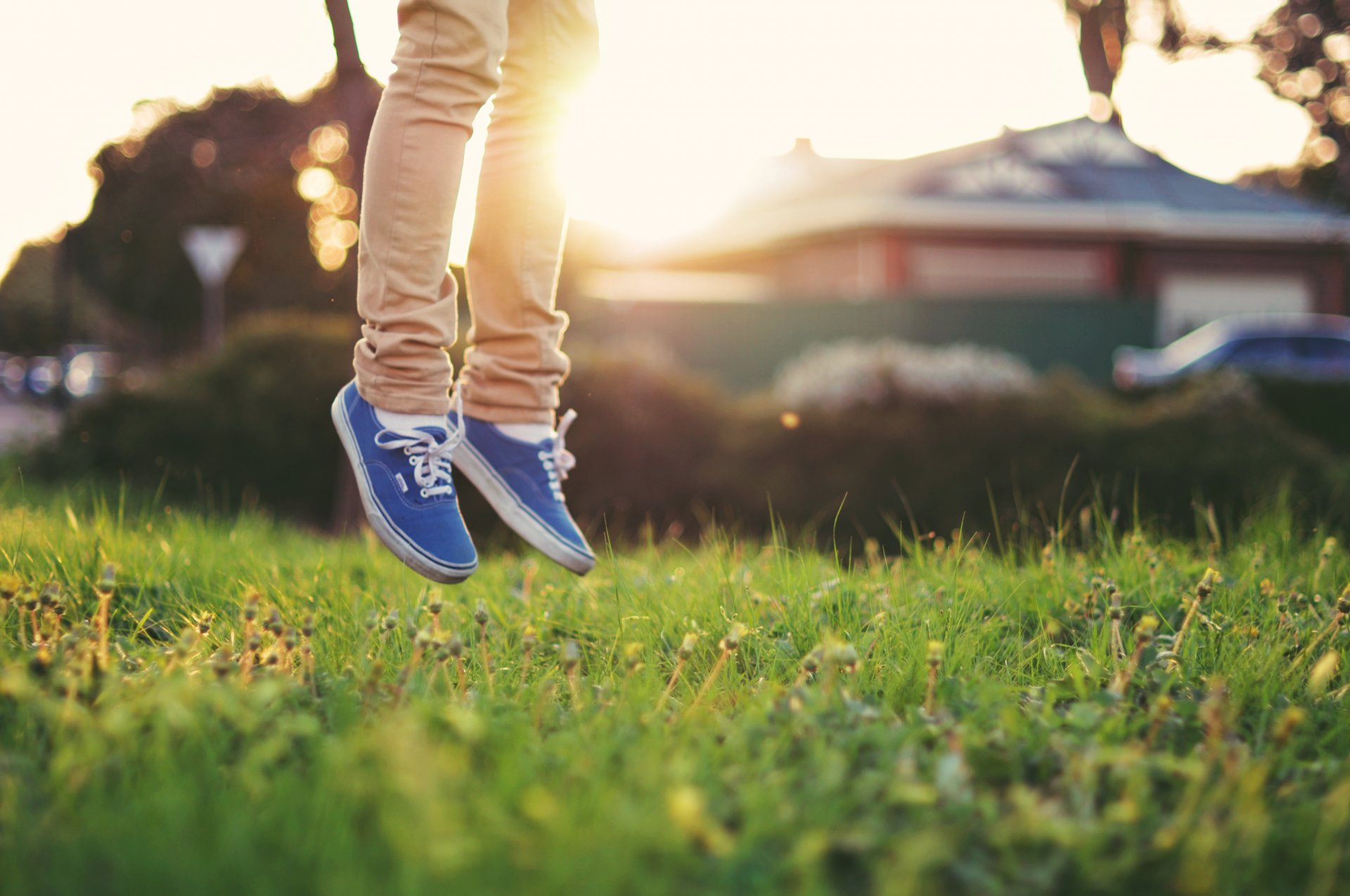 Jump in sneakers over the green pale