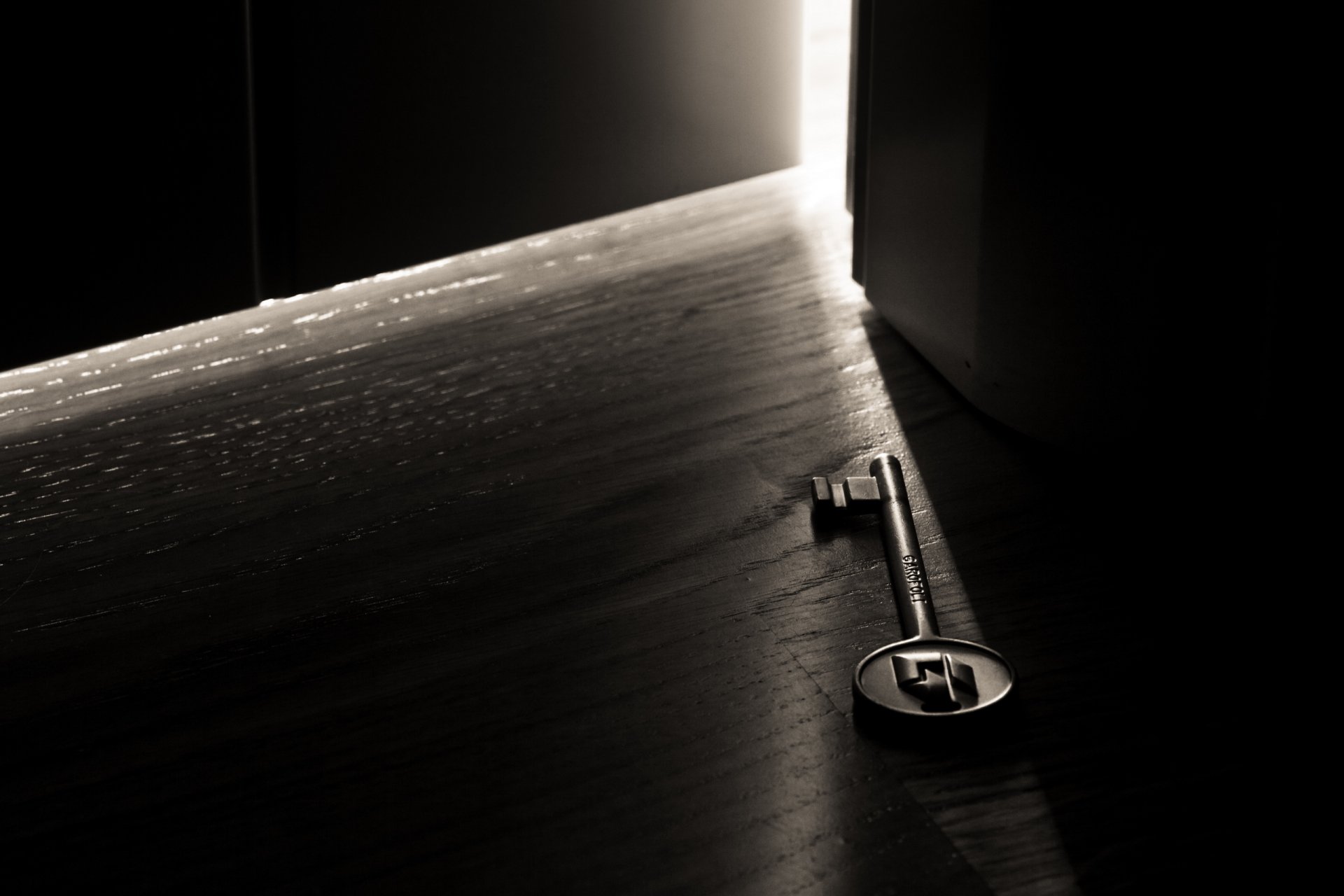 The key is next to the open door from which the light is pouringThe key is next to the open door from which the light is pouring