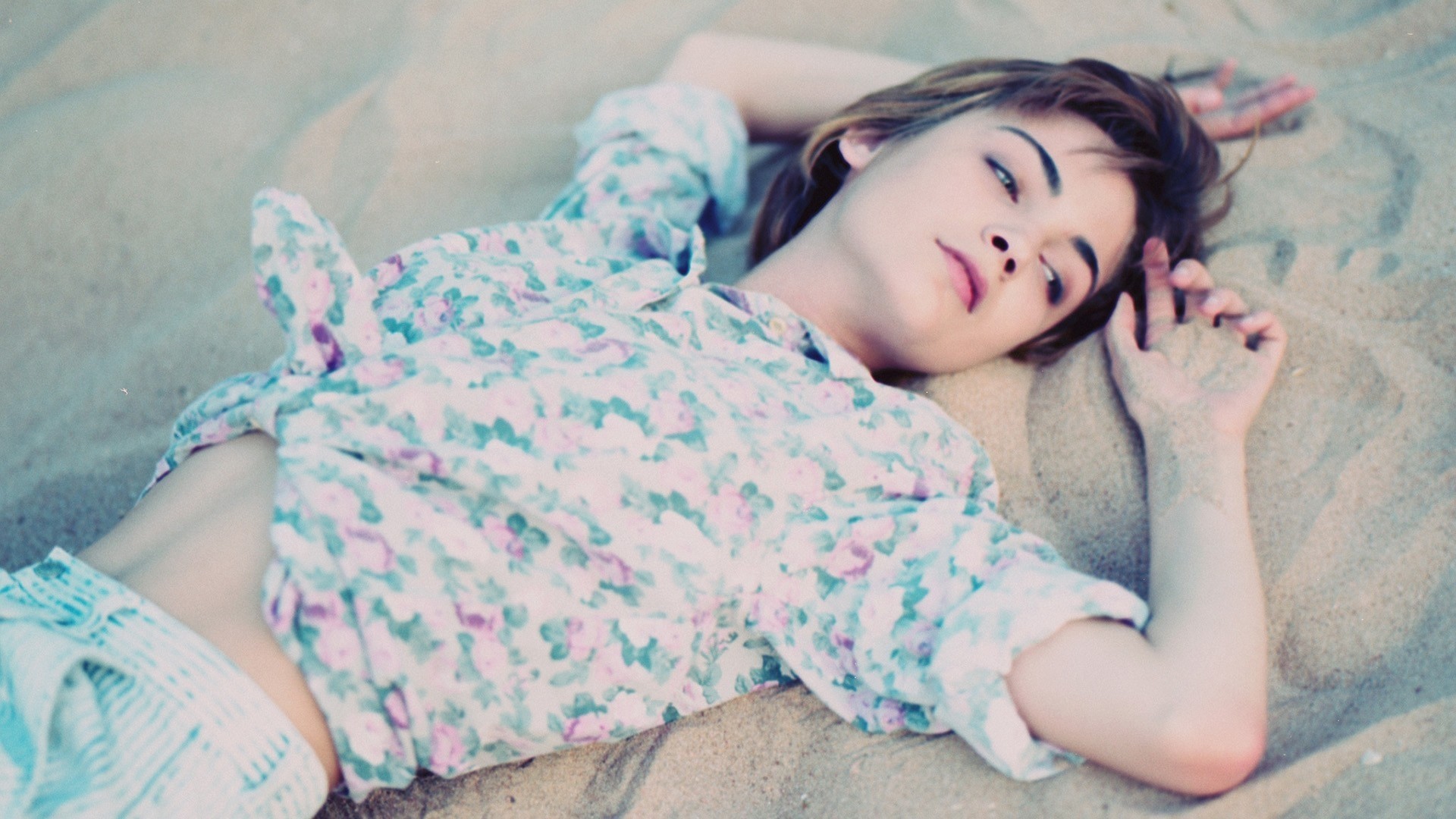 Portrait of a girl with a languid look and wind in her curlsPortrait of a girl with a languid look and wind in her curls