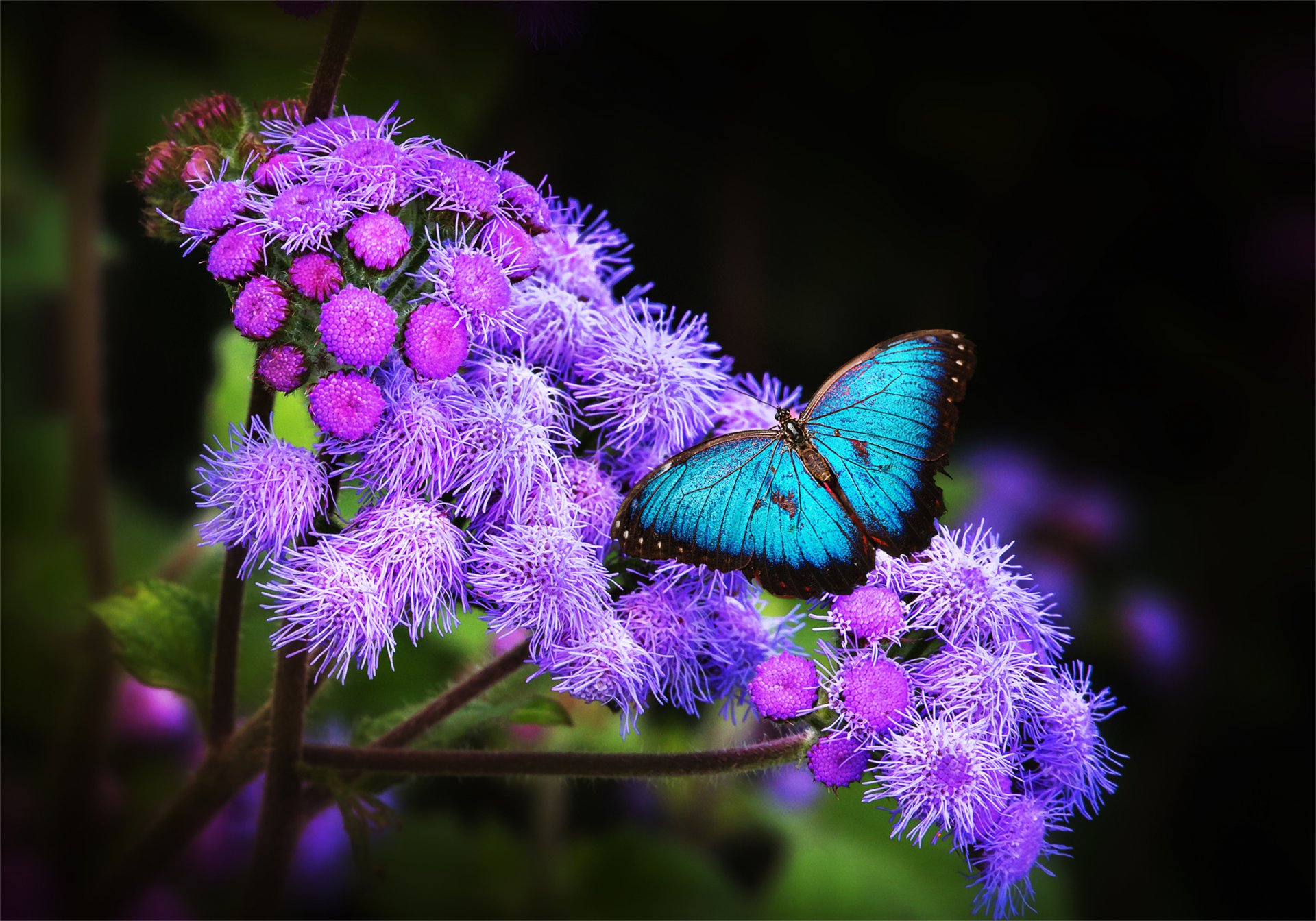 Exotic photo of a butterfly on flowers. Blue butterfly and purple flowers