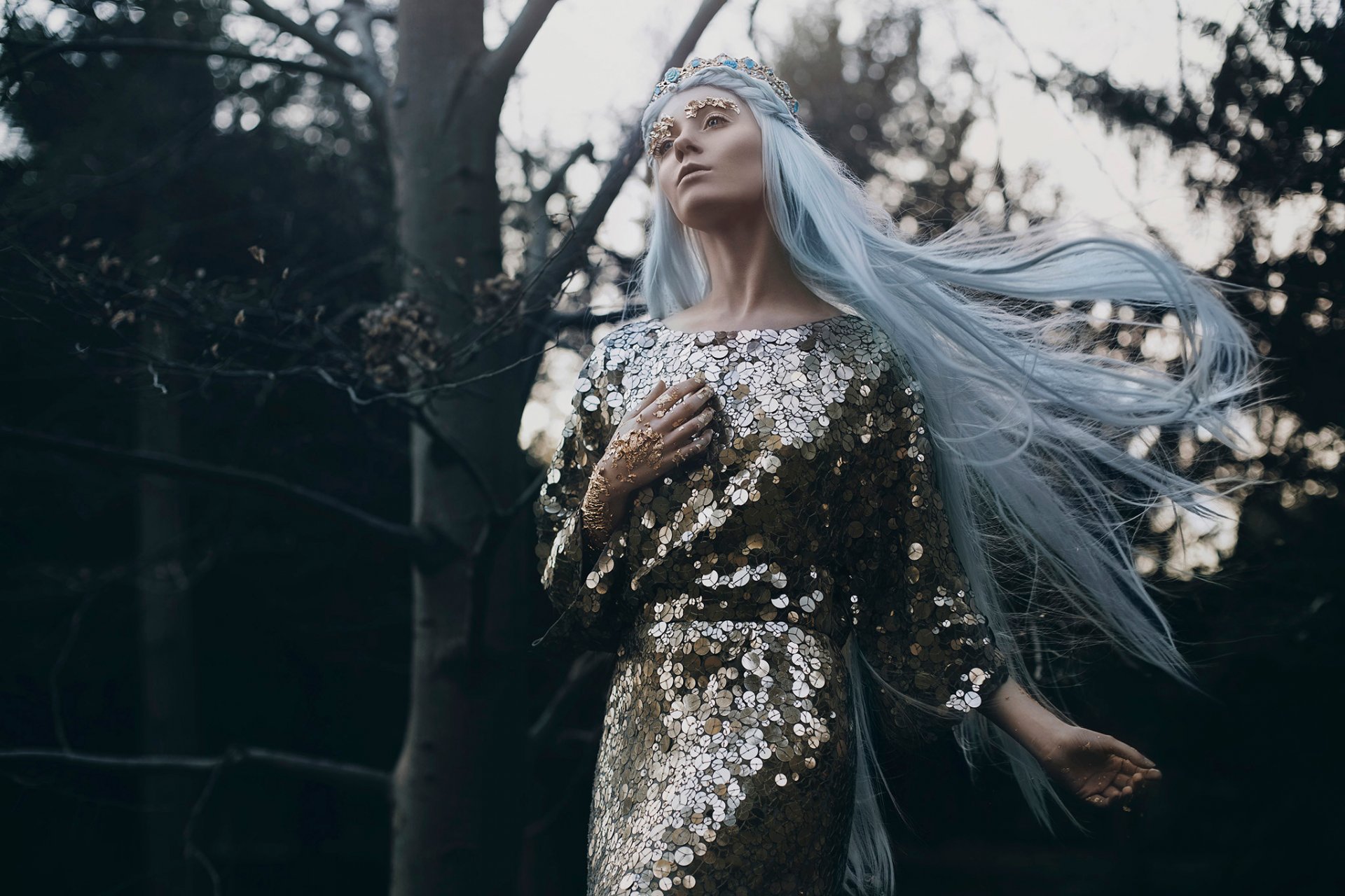 A girl with silver hair on a black and white backgroundA girl with silver hair on a black and white background