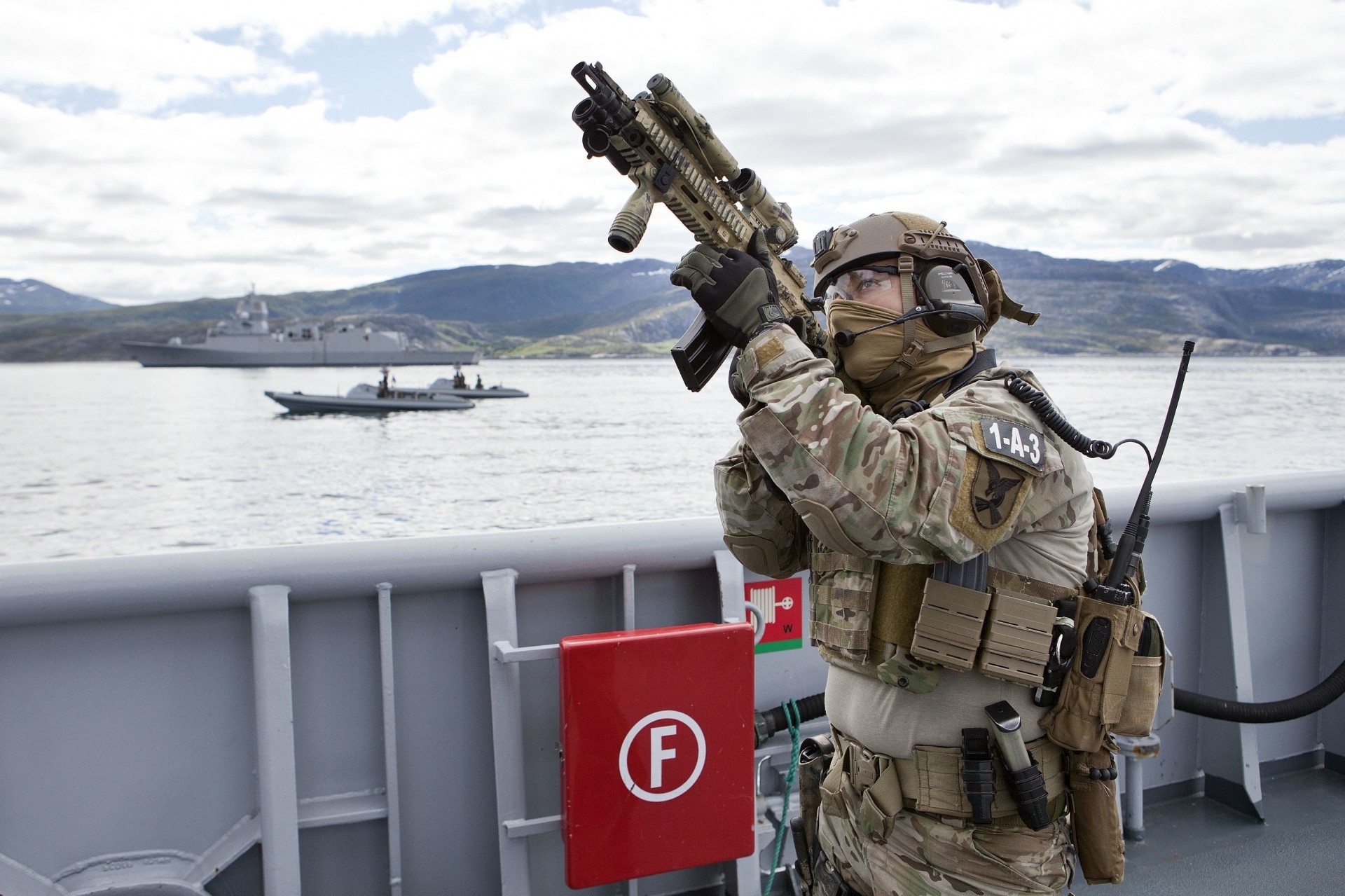 A soldier with a gun on the background of mountainsA soldier with a gun on the background of mountains
