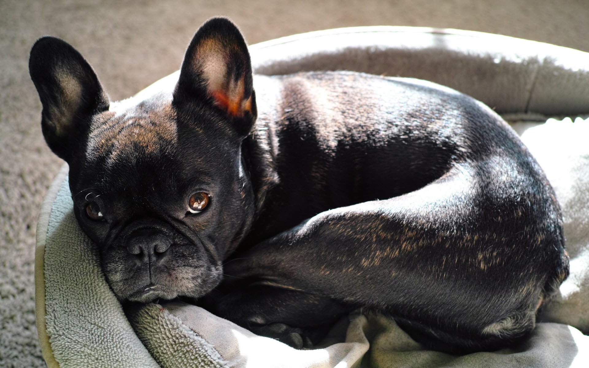 A bulldog with big ears is lying on a sunbed
