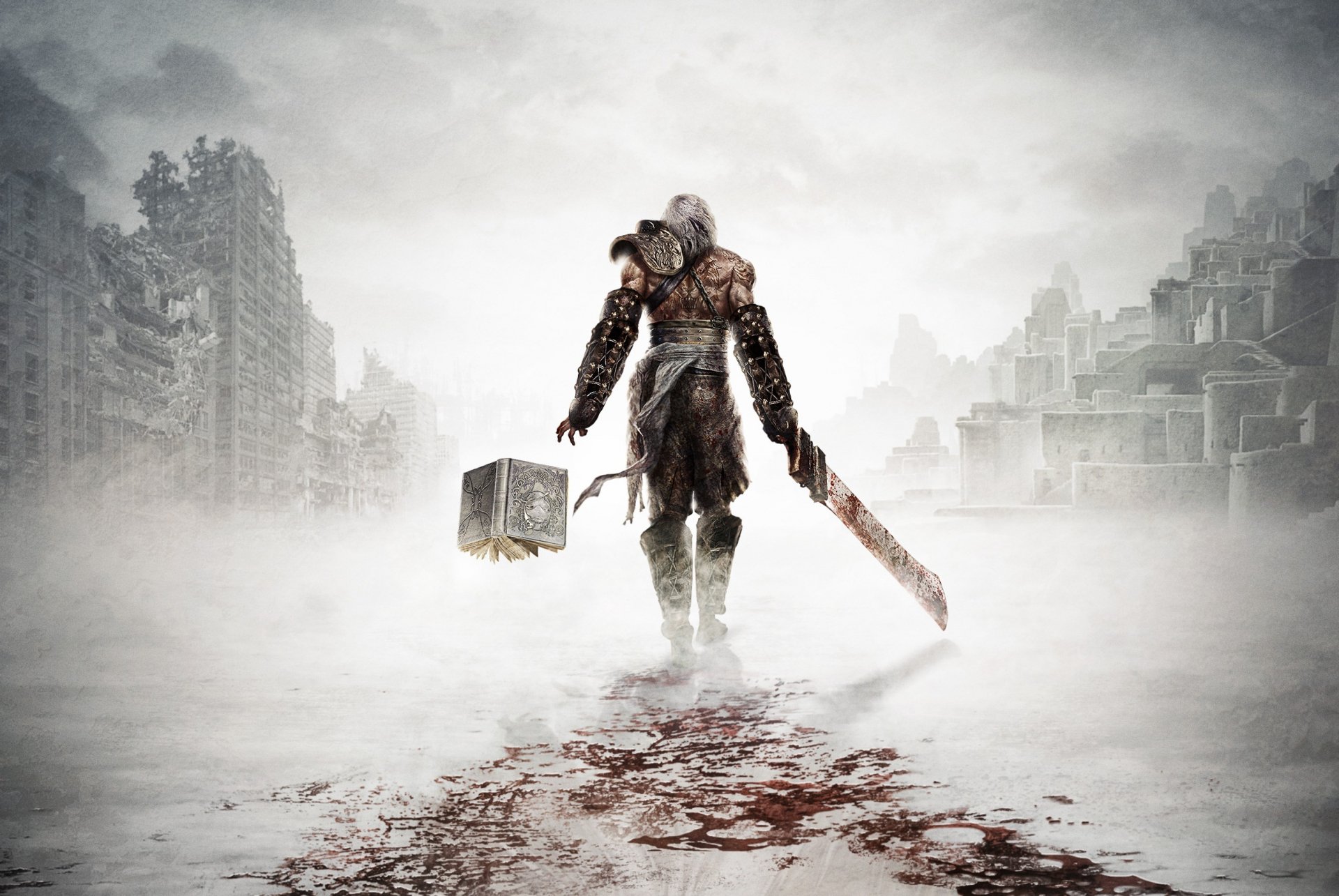 A hero with a grimoire and a sword leaving blood behind