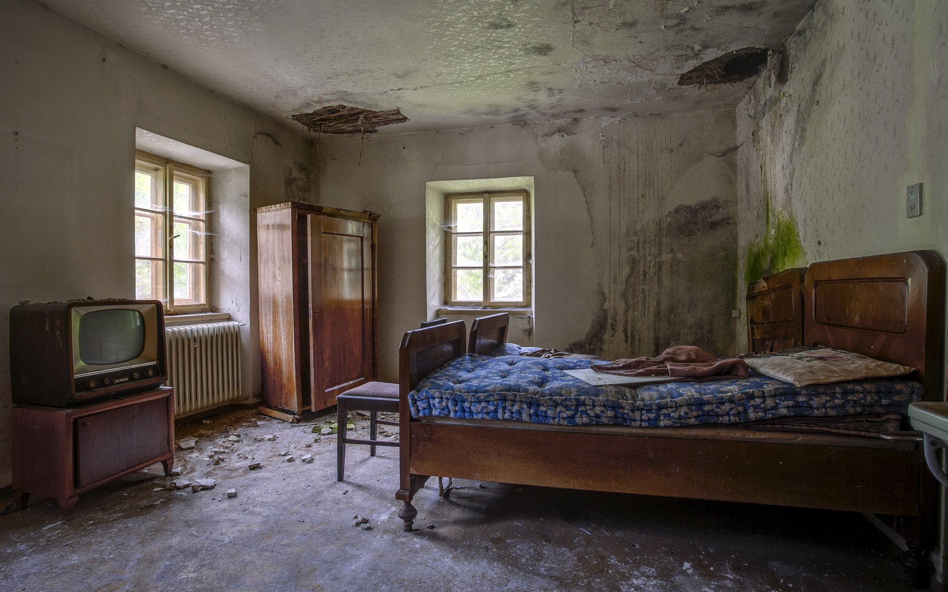 An open coffin lined with red silk fabric standing on the floor of an old abandoned roomAn open coffin lined with red silk fabric standing on the floor of an old abandoned room