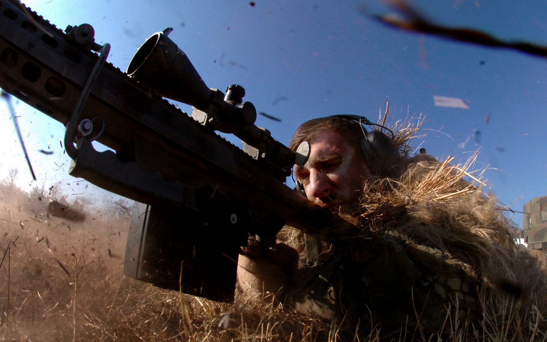 The sniper disguised himself in the grass and liesThe sniper disguised himself in the grass and lies