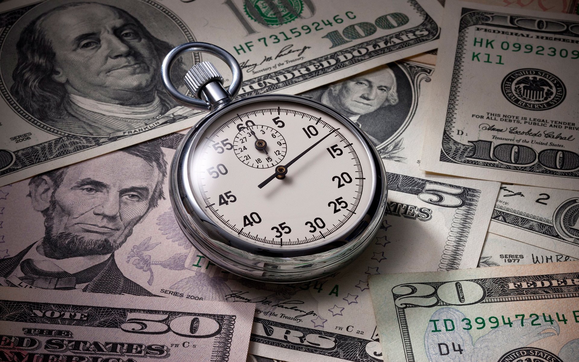 Four men in suits are sitting at a table with money on it and women's feet in red shoes are visibleFour men in suits are sitting at a table with money on it and women's feet in red shoes are visible