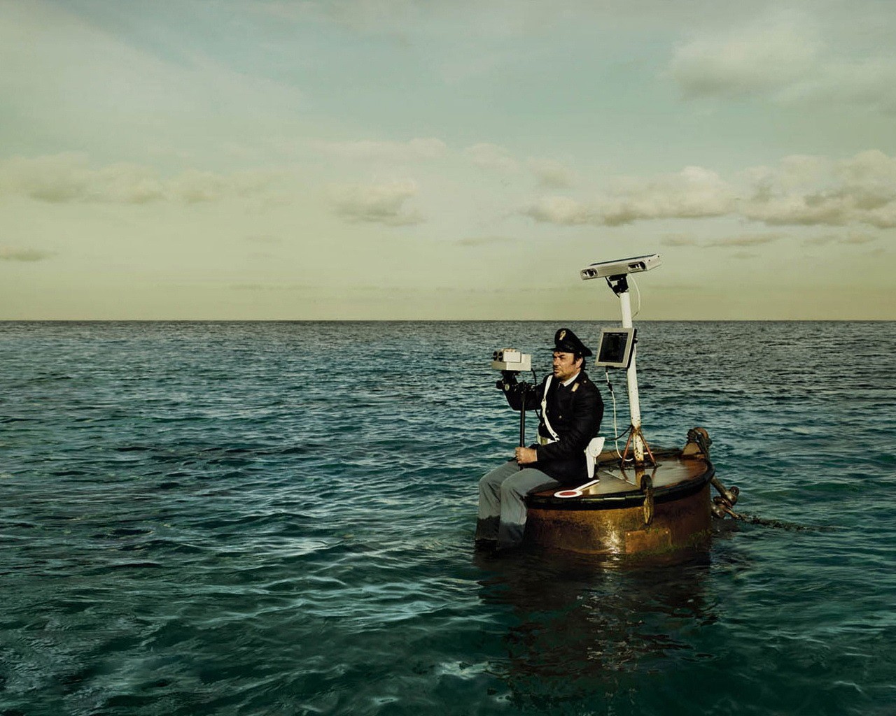 Traffic police inspector on a barrel in the sea with radarTraffic police inspector on a barrel in the sea with radar