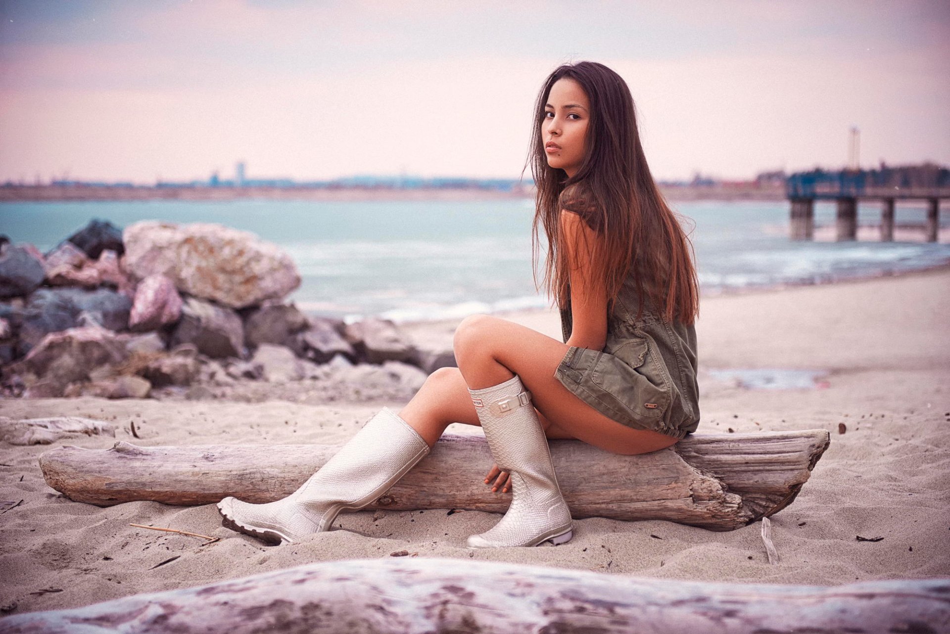 A brown-haired woman in boots poses naked in an interesting angleA brown-haired woman in boots poses naked in an interesting angle