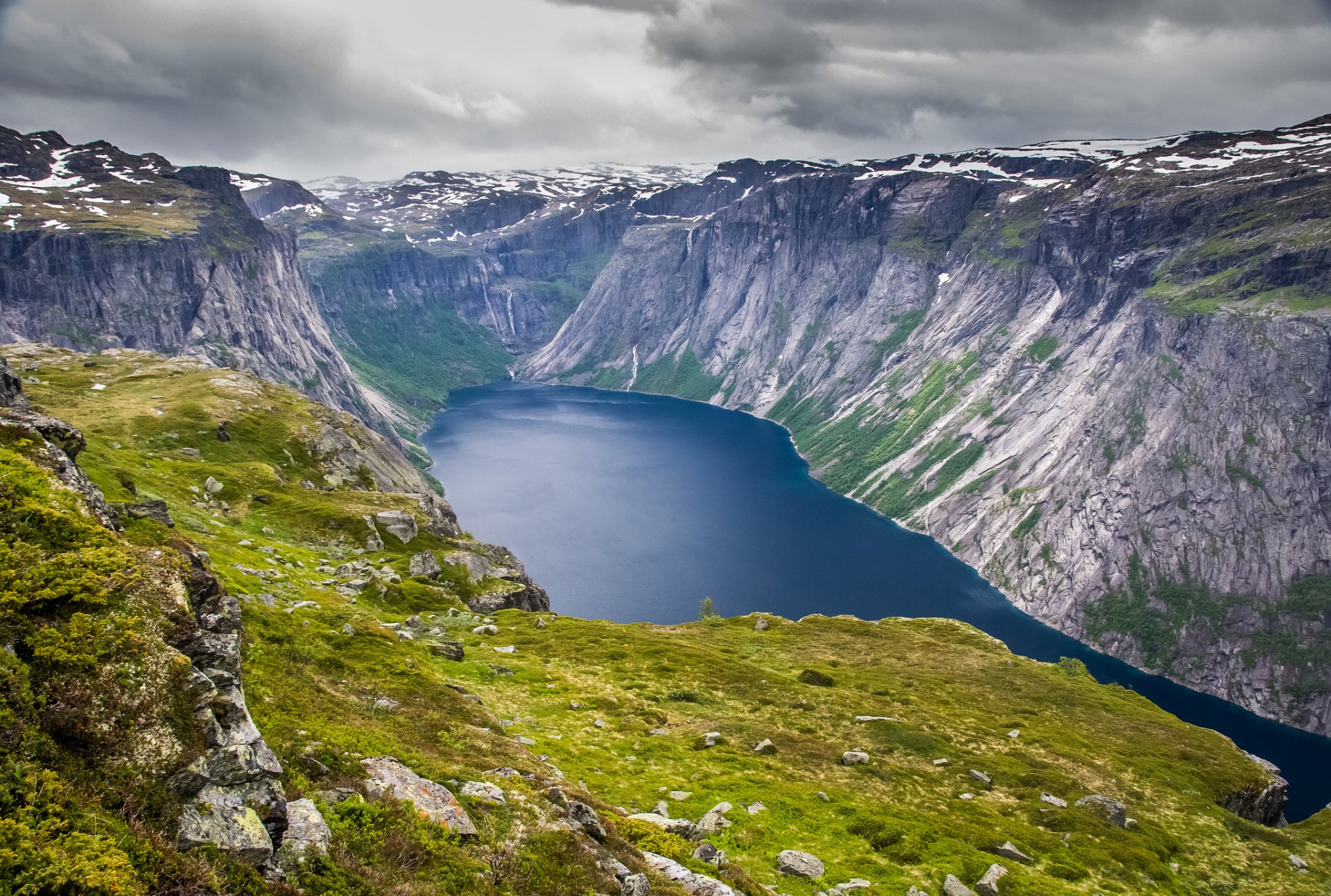 A lake in the middle of the mountains under a gray skyA lake in the middle of the mountains under a gray sky