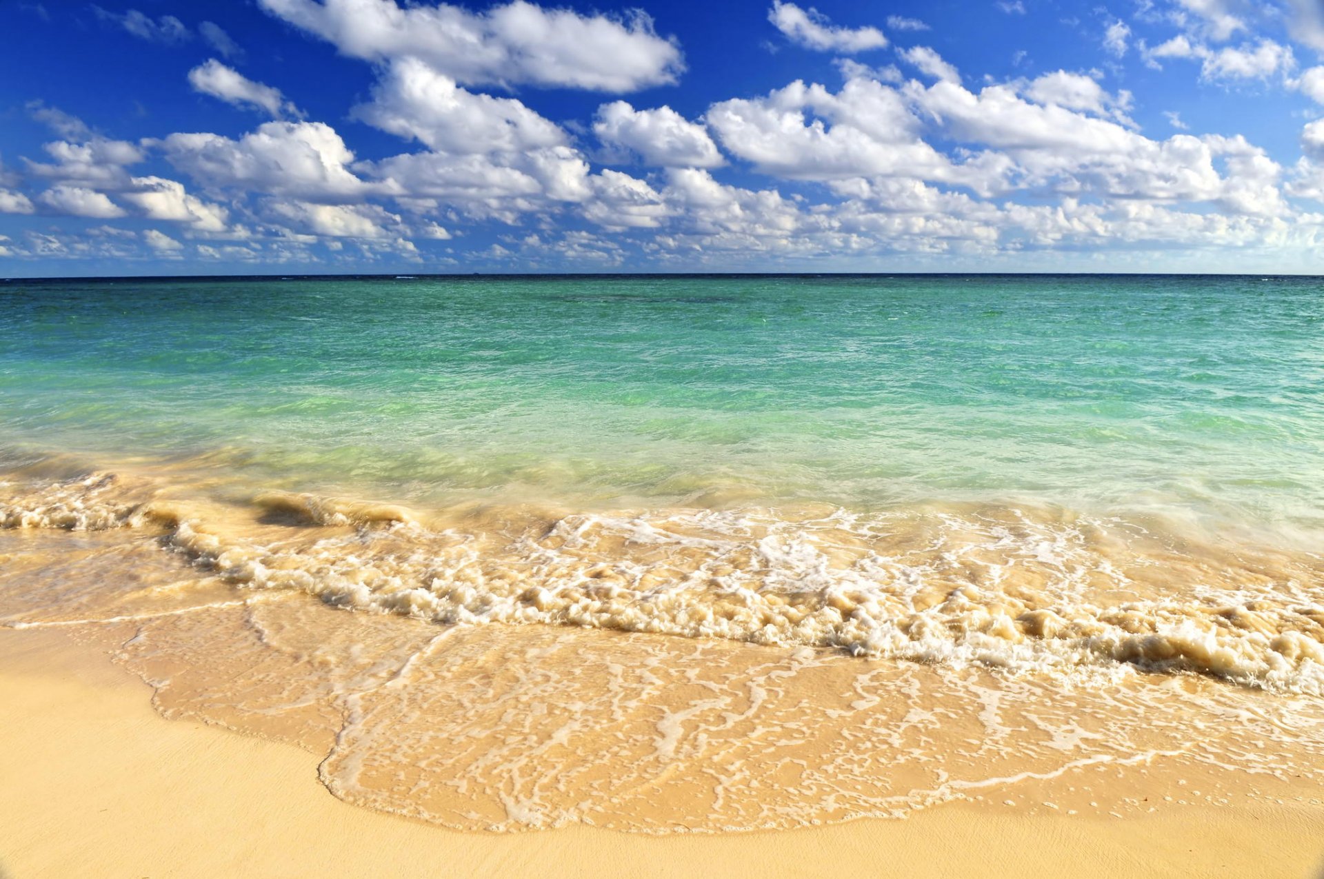 Sandy beach, illuminated by the sun, surrounded by palm treesSandy beach, illuminated by the sun, surrounded by palm trees