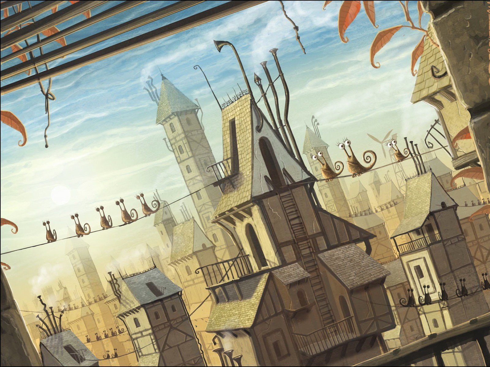 Drawing of a city in which snails crawl along wiresDrawing of a city in which snails crawl along wires