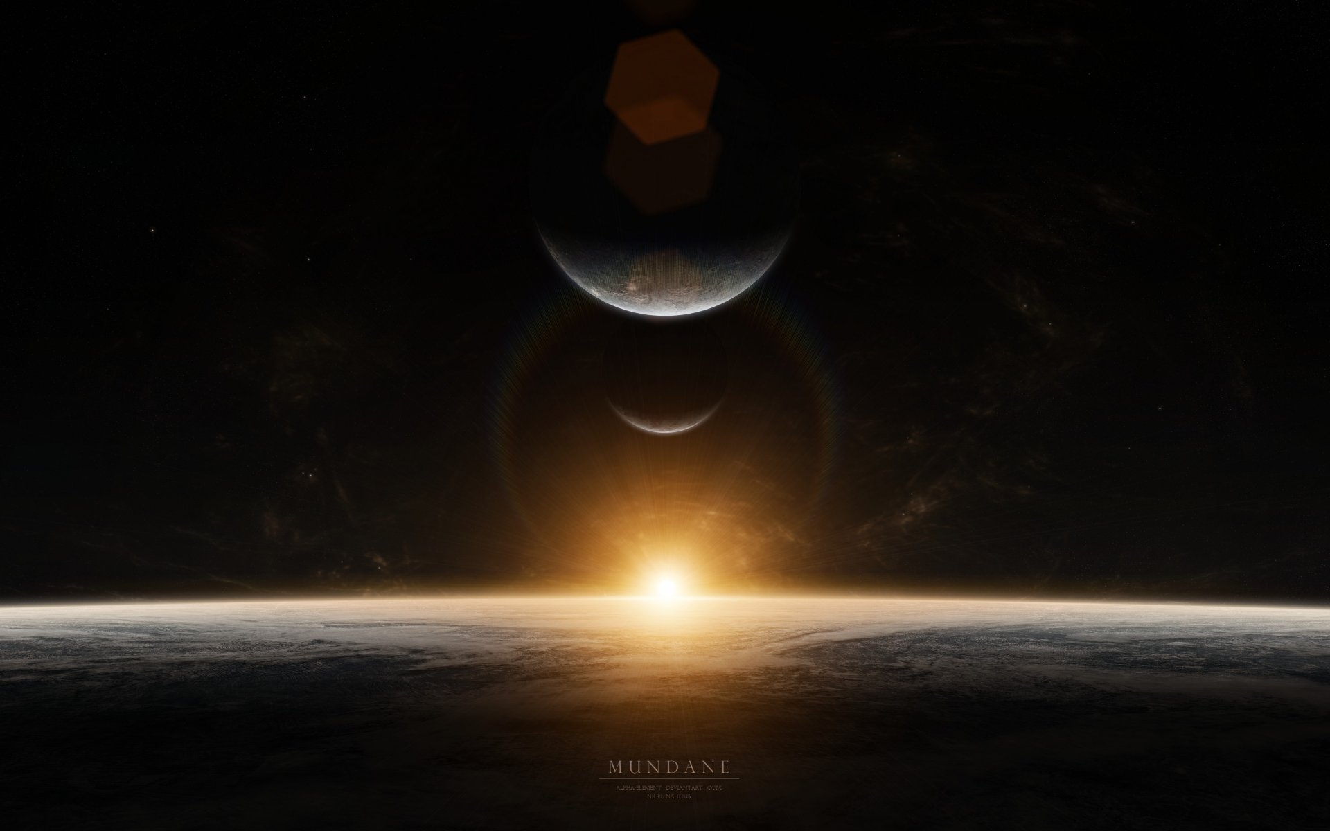 Drawing of the Earth's surface and the glow of sunlight from a star