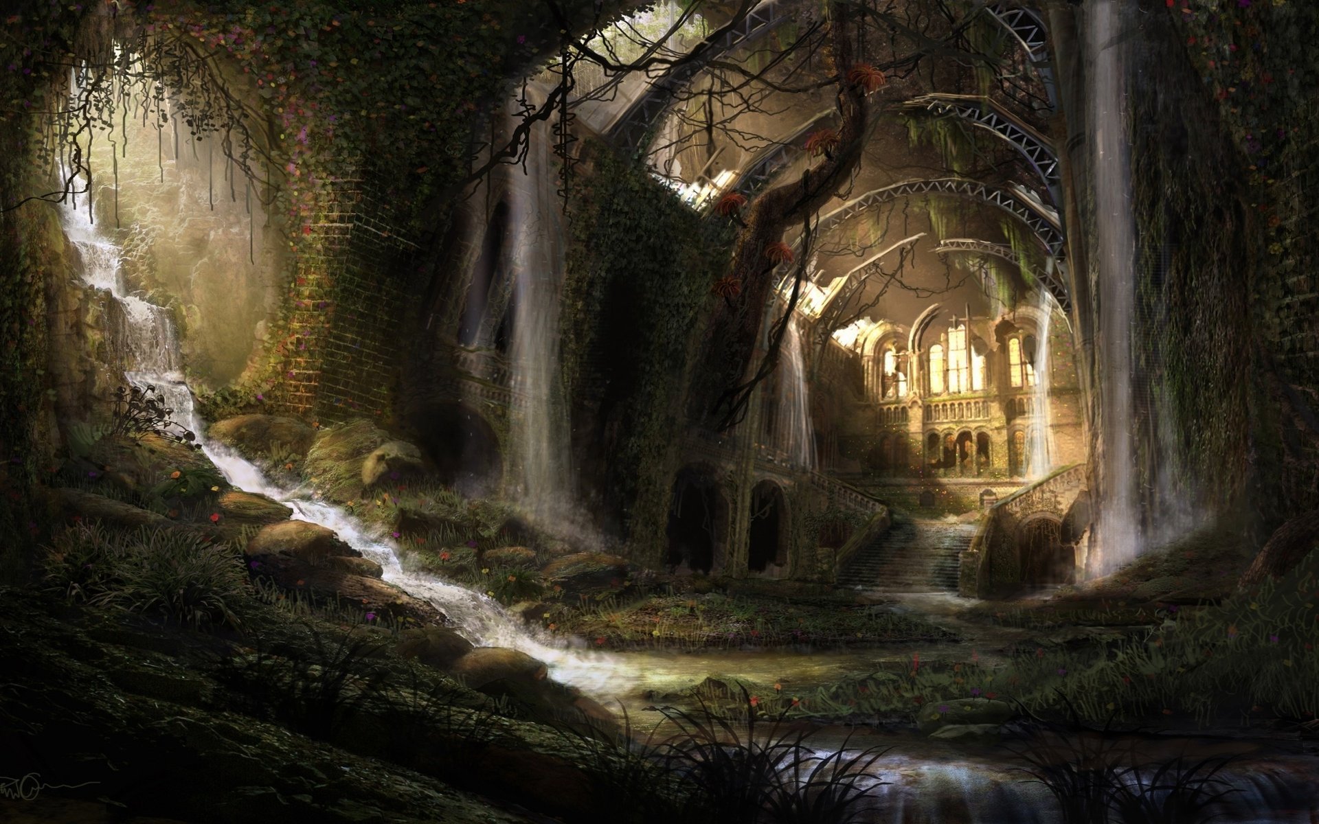 Mysterious ruins, a waterfall enliven a mysterious caveMysterious ruins, a waterfall enliven a mysterious cave