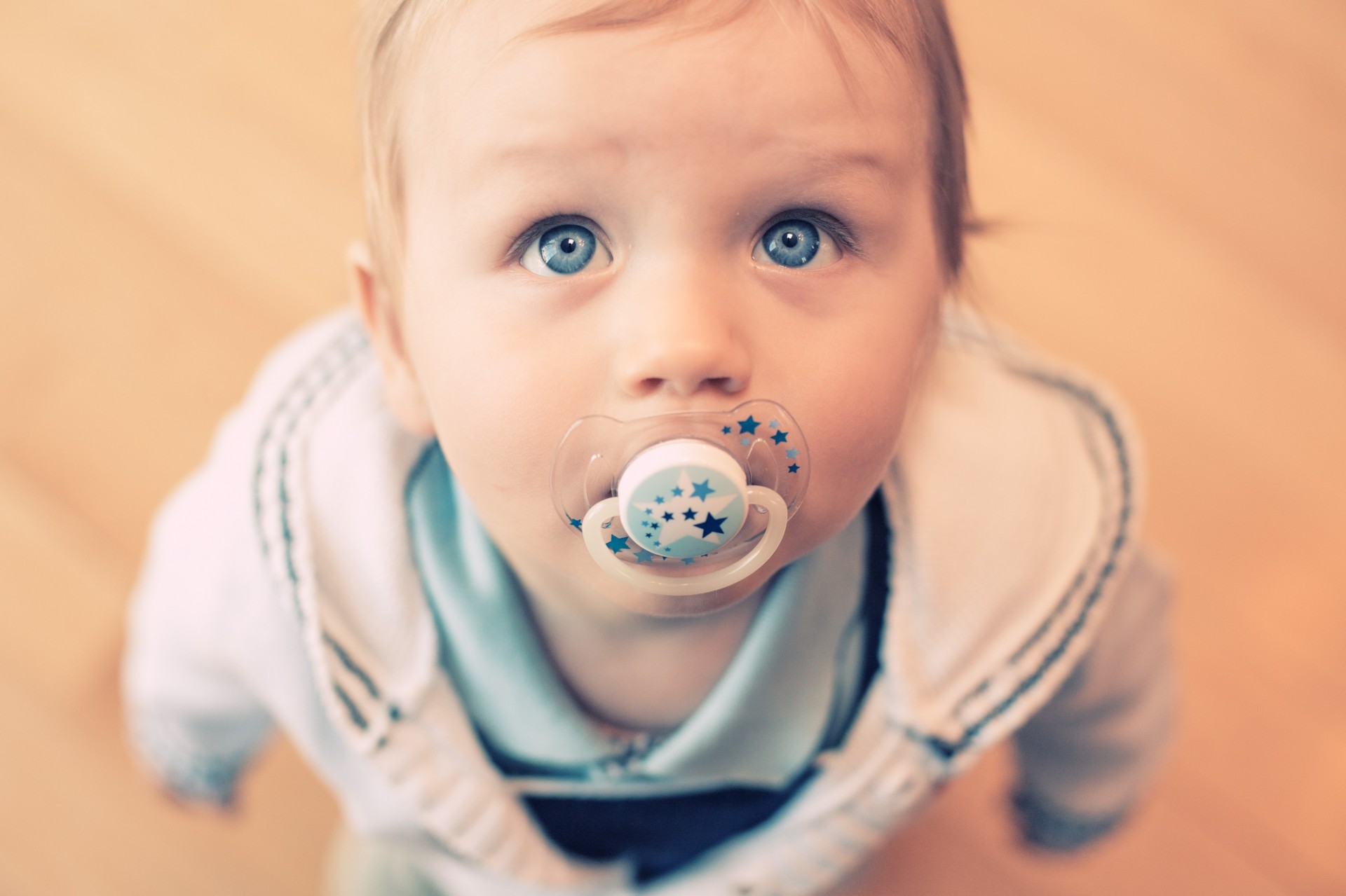 A child with blue, beautiful eyes sucks a pacifierA child with blue, beautiful eyes sucks a pacifier
