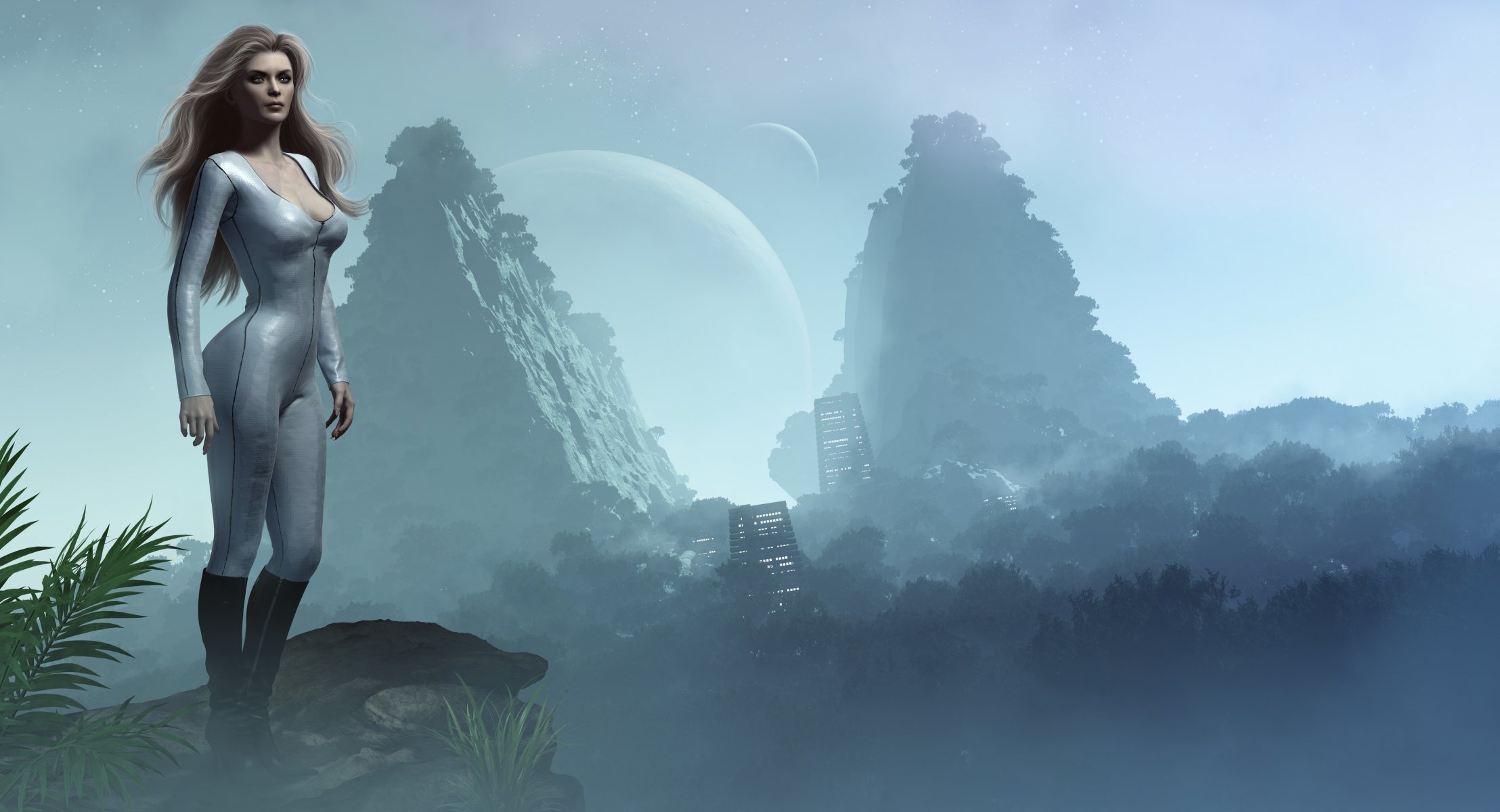 An alien in a tight-fitting technological suit with a weaponAn alien in a tight-fitting technological suit with a weapon