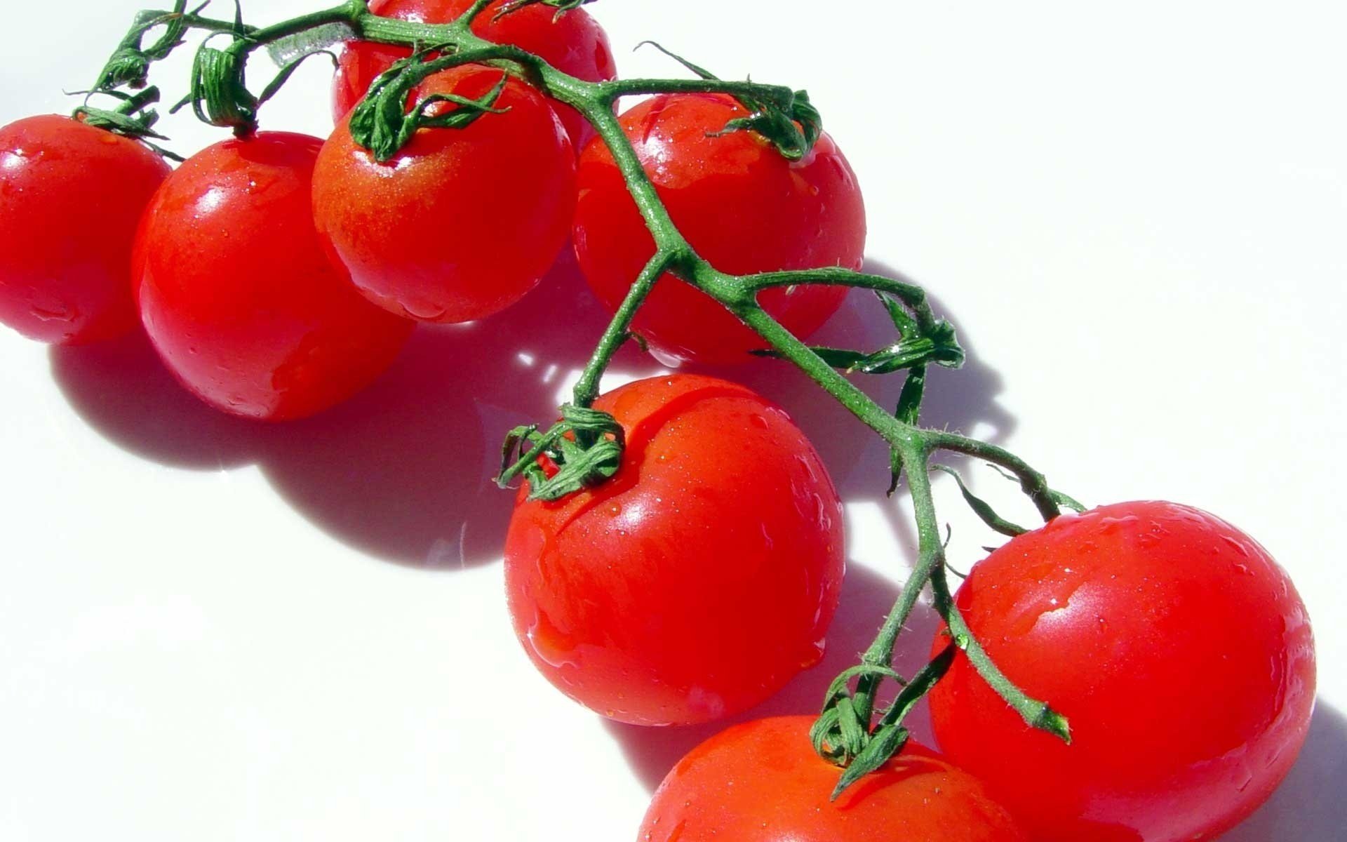 On a white table is a white plate with a cherry tomato and a forkOn a white table is a white plate with a cherry tomato and a fork